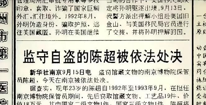 1994年,盗窃馆藏文物的南京博物院保管员陈超,在南京依法处决。在职期间,先后窃取馆藏文物、工艺品19件,其中国家二级文物1件,国家三级文物1件,他将盗窃的部分文物销赃后得款3万多元,全部挥霍无余。 1988年,20岁的陈超从南京一所中专毕业,他学的文秘档案专业,被分配到南京博物院,做文物保管工作。 在当时,能进博物院上班,每天接触国宝,是很多人求之不得的机会,但陈超没珍惜,反而盯上了手里看管的文物。 1990年,陈超还在试用期,他协助清点文物时,看到库房里有紫砂做的小核桃、小水果工艺品,一时没忍住,偷偷揣了几个放进衣兜。 这次没被发现,陈超的胆子越来越大,他慢慢摸清了库房的管理漏洞,进出虽要登记,但对内部人员检查不严格,文物清点也有盲区,少几件小东西,短时间内查不出来。 1992年12月,陈超要调离保管岗位,移交工作时,他趁接替的人不注意,从库房偷了一只玉鸳鸯壶,这件是国家三级文物,按当时物价,价值不少。 陈超很快找到人卖掉玉壶,拿到了第一笔大钱,尝到甜头后,他彻底收不住手。 从1993年3月到9月,半年时间里,他又先后偷了翡翠扳指、玉手镯、白玉刀等18件文物和工艺品,其中还有一件国家二级文物青玉含灵芝,价值很高。 他的作案手法很简单,利用自己保管员的身份,趁午休或者清晨提前到岗,把小件文物藏在衣服内袋或随身包里,带出库房。 库房门口只有一道保安岗,保安对内部工作人员没什么戒备,他每次都能顺利出去,偷来的文物,陈超全卖到了南京夫子庙、朝天宫的古玩市场,他不懂文物鉴赏,又急着换钱,很多珍贵文物都被低价收走。 这些卖文物的钱,他没存一分,全用来买进口音响、摩托车,还去深圳旅游,挥霍一空。 1993年下半年,南京博物院进行例行文物清点,工作人员核对后发现,19件文物不翼而飞,博物院立刻报警。 警方介入后,很快把怀疑对象锁定在内部人员身上,陈超作为曾经的保管员,自然成了重点排查对象。 一开始,陈超还想抵赖,但警方很快找到了他销赃的证据,在铁证面前,他只能交代所有犯罪事实,他坦言,以为库房文物多,少几件看不出来,就是想搞点钱花花,根本没意识到自己的行为有多严重。 1994年6月,南京市中级人民法院作出一审判决,陈超利用职务之便,盗窃国家珍贵文物,情节特别严重,构成盗窃罪,判处死刑,立即执行。 陈超当庭表示不上诉,经过最高人民法院核准,1994年9月15日,陈超在南京被依法处决,年仅23岁。 案发后,警方沿着陈超的销赃线索追缴文物,最终19件涉案文物全部被追回,没有造成永久性流失,之后全部归还南京博物院。 这起案件,也给全国文博系统敲了警钟,国家文物局随后下发通知,要求各地博物馆完善库房管理制度,堵住管理漏洞。 以上部分内容是小编个人看法,如果您也认同,麻烦点赞支持!有更好的见解也欢迎在评论区留言,方便大家一同探讨。