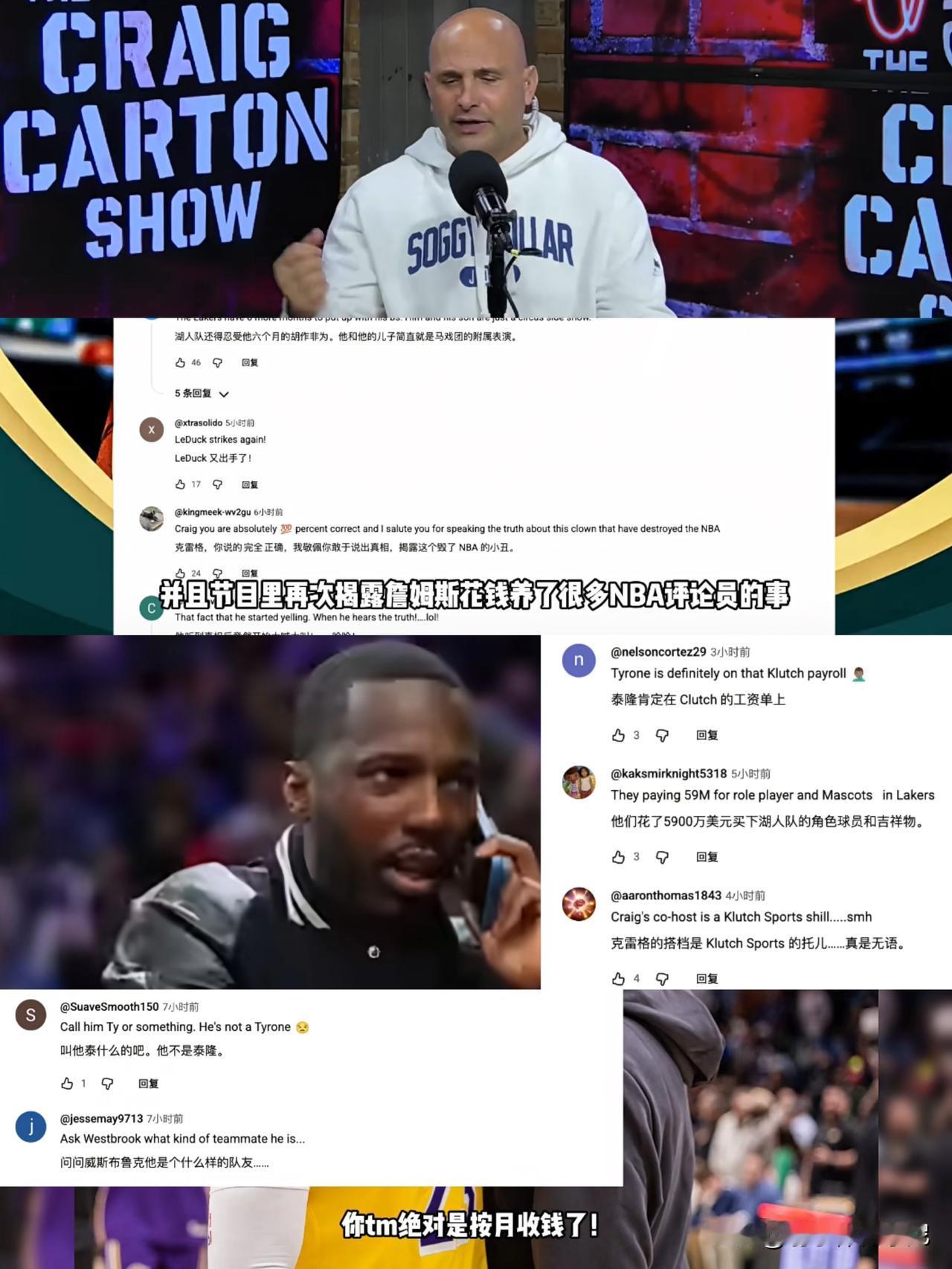 美知名体育评论员克雷格-卡顿在自己的播客节目《卡顿秀》中联合詹姆斯热火时期的队友埃迪-琼斯讥笑詹姆斯甩锅总决赛失败是因为角色球员发挥不好的名梗;还公开嘲讽詹姆斯是一个自恋狂、数据刷子、懦夫、水平太菜打不了高端局。并且公开揭露詹姆斯花钱养了很多NBA评论员和媒体的事实。 炸裂的是,卡顿的节目搭档泰隆-约翰逊试图为詹姆斯辩解,被卡顿当面质疑他是不是也收了詹姆斯的钱? 约翰逊解释道:自己没有收过詹姆斯的钱,不过,如果詹姆斯给自己开出支票的话,那肯定会收的。 卡顿表示不相信约翰逊的话,说:你小子肯定按月收到了詹姆斯的支票。