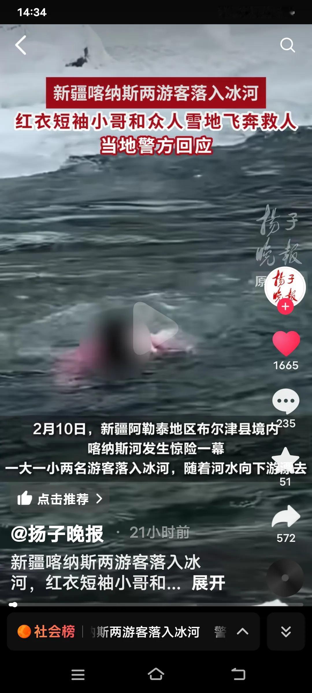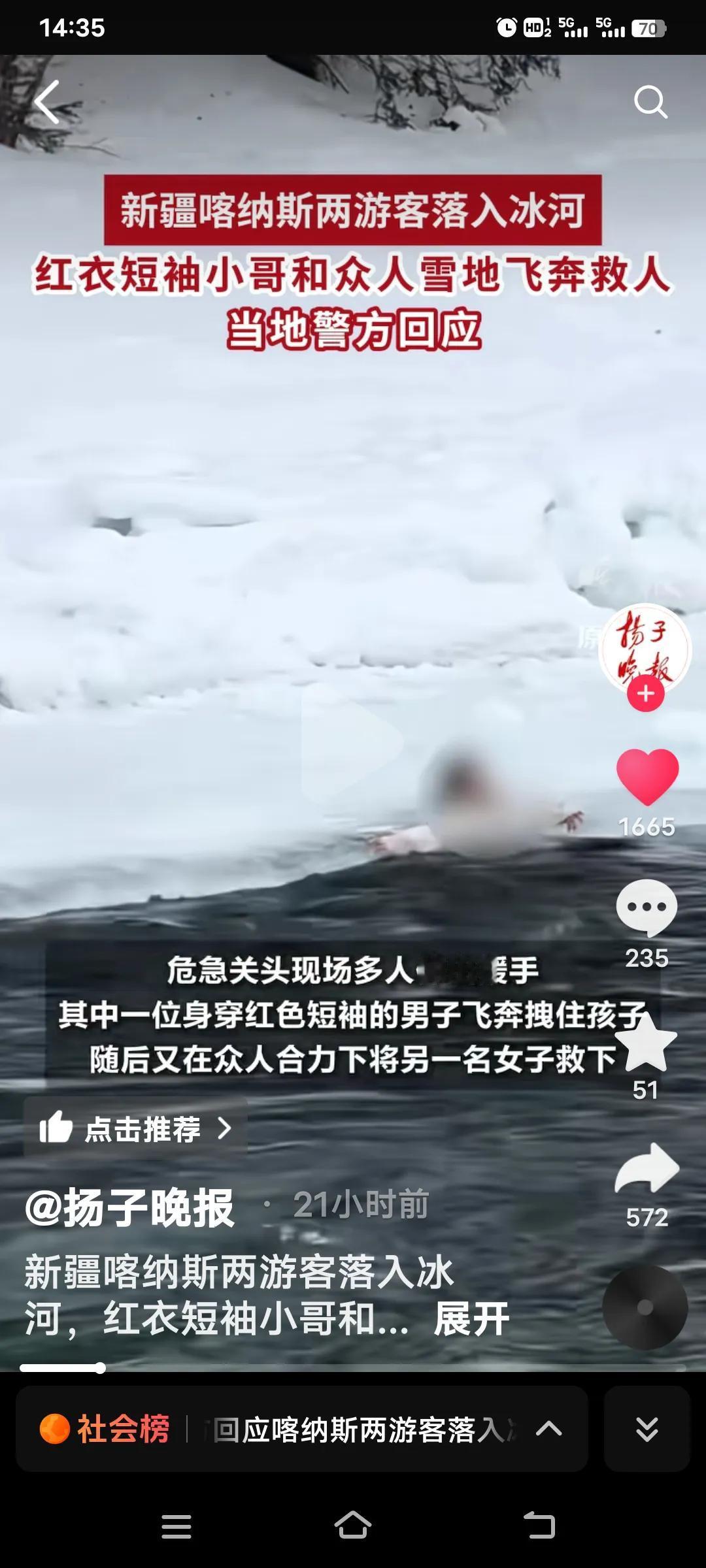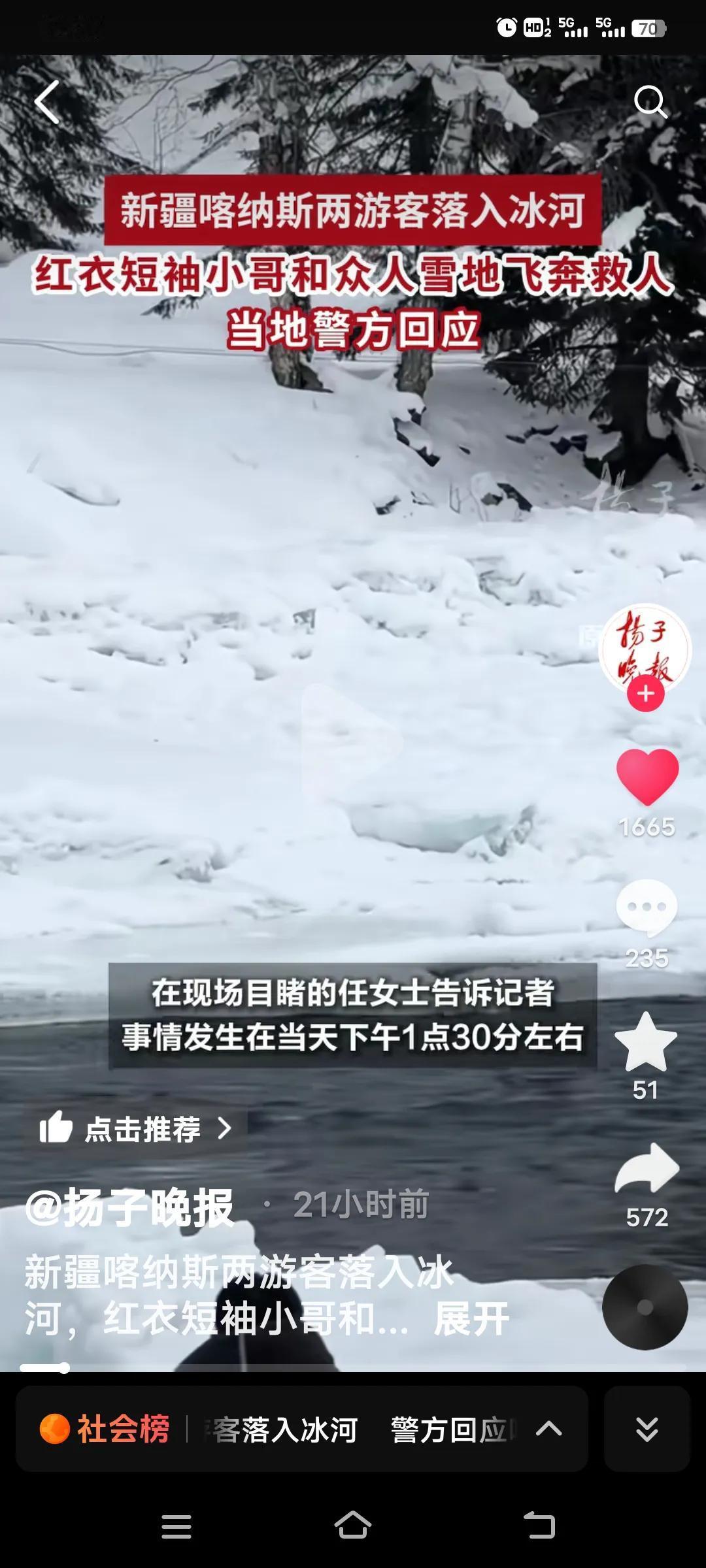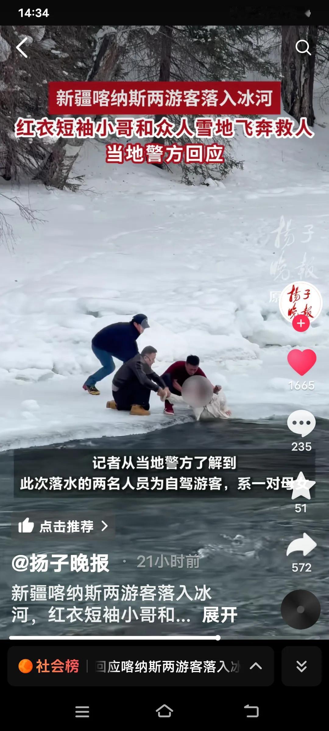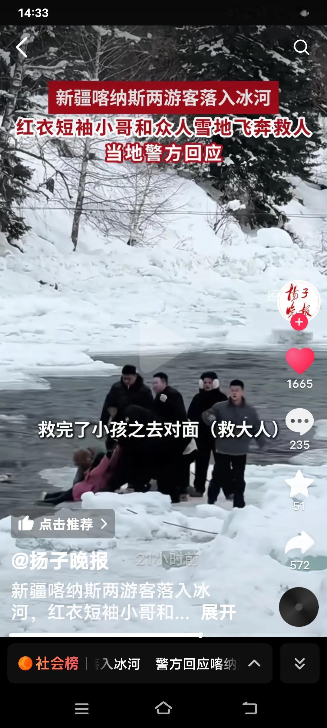 2月10日下午1点30分,新疆喀纳斯景区河畔发生了一场惊险救援。一名女孩不小心滑进湍急的冰河,母亲见状跳入河中营救。小女孩落入水中后有些呛水,母亲则被冰块困住。一群人赶忙过来救援。 此时,38岁的本地向导兼司机邓子龙,也就是那位红衣小哥出现了。他听到呼救声后,迅速飞奔到河岸,在其他游客的协助下,先把女孩拉上了岸,又折返救起了她的母亲。女子被救上岸时浑身无力,已到身体极限。 好在母女俩送医后并无生命危险。红衣小哥在雪地里飞奔救人的举动简直太帅了,为他的勇敢点赞!真是太幸运了,母女都平安无事,年前无灾无难,就安心过个好年吧! 喀纳斯 美景喀纳斯 喀纳斯旅游路线
