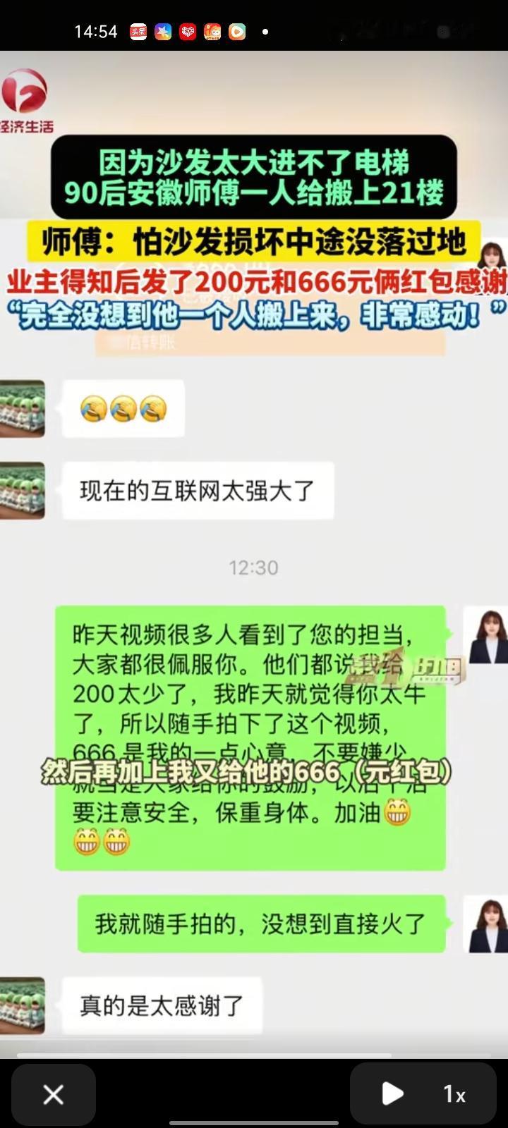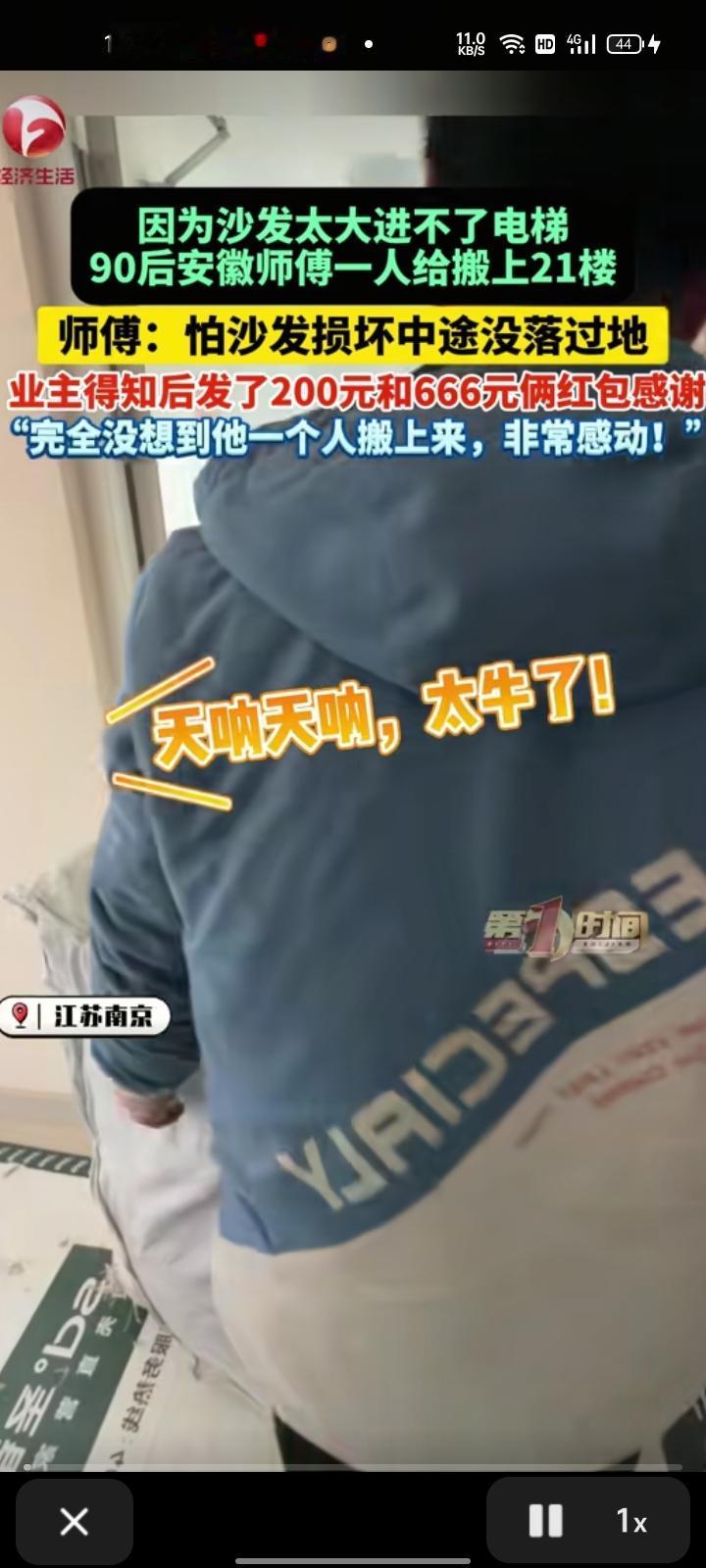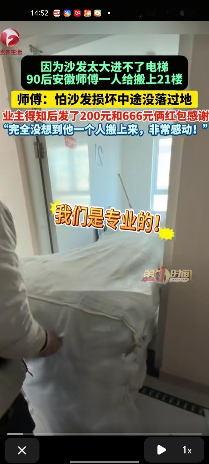2月8日,江苏南京。网友“南京胖胖探房”发视频称,因为沙发太大进不了电梯,师傅一人扛沙发到21楼。本以为会有同事来帮忙,没想到一个小时后他是一个人来搬,非常佩服。问后得知,这是怕沙发损坏,中途没落过地。 商家给出800元,她发了200元和666元两个红包以示感谢。她表示,师傅是90后的安徽人,育有两个孩子,师傅让她对大家表示感谢,没想到大家以这样的方式来夸他。
