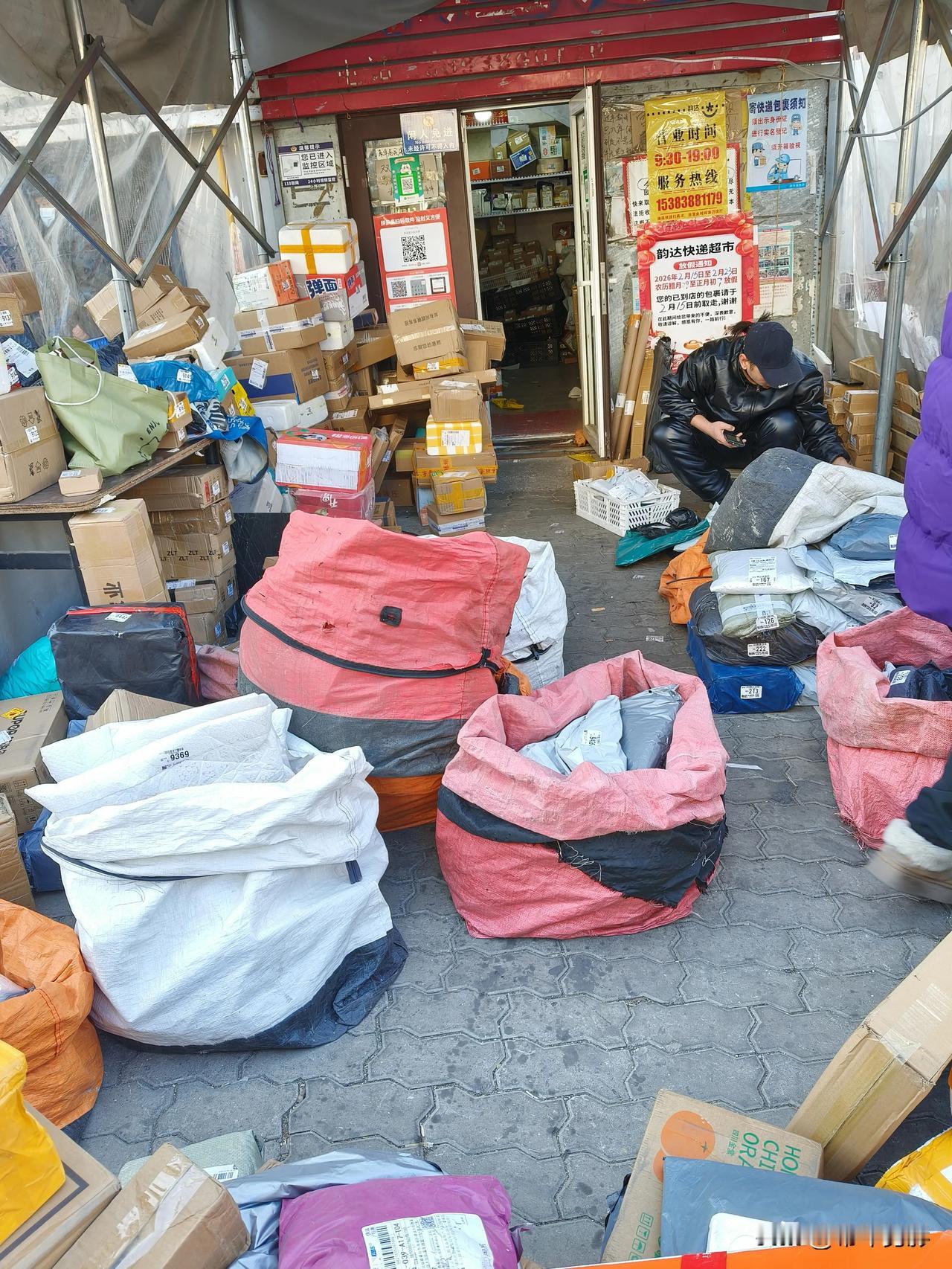 清晨的街道上,快递包裹已堆成了小山,纸箱、布袋裹着棕、黄、粉、灰的色调,在冬日里