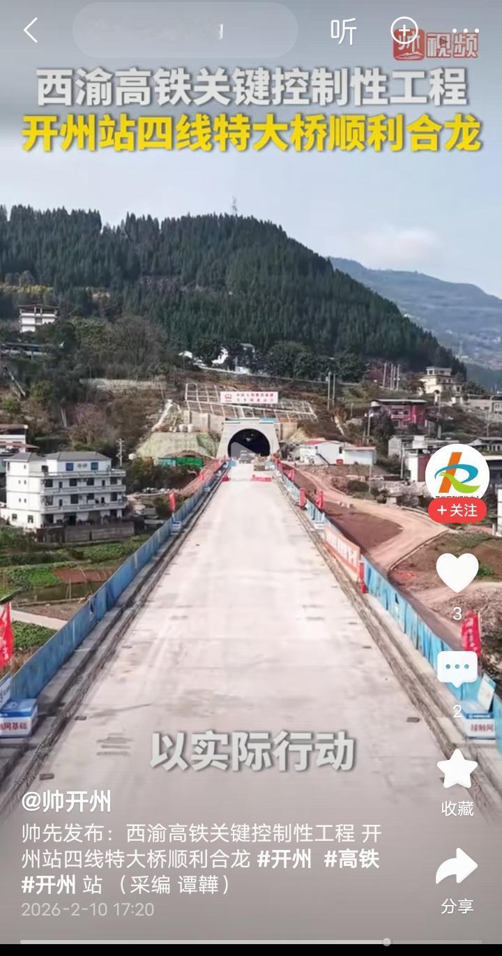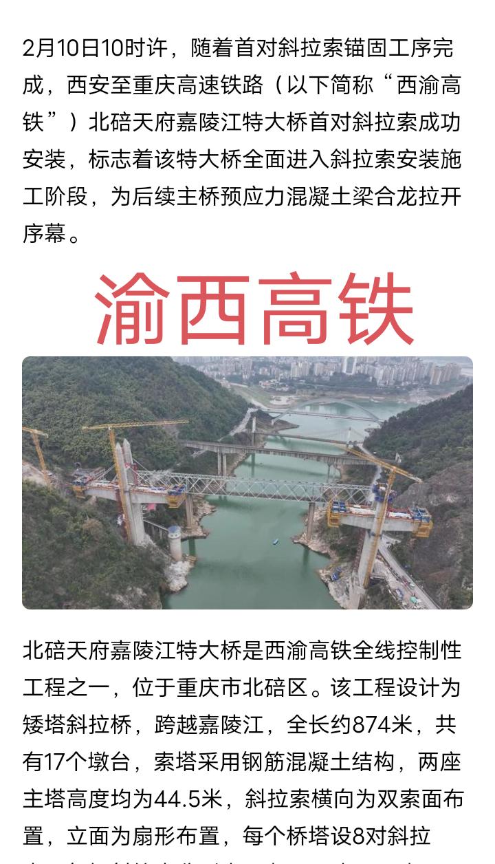 新进展,重庆途经达州至西安时速350公里的渝西高铁控制性工程开州站四线特大桥顺利合龙,全长874米的北碚嘉陵江特大桥已经开始安装斜拉索,13台27线的西安东站已经顺利挂牌亮相,4台10线的安康西站和3台7线的广安东站正在全速建设中,预计2026年底西安东至安康西段将率先开通投入使用,重庆西至安康段的478公里预计2028年开通运营,届时重庆坐高铁来往西安的时间缩短至2.5小时左右,比现在走西成客专绕行成都要节省一半的时间,沿途的大竹、宣汉、城口和开州等地将结束不通高铁的历史,对促进沿途城市区县旅行业和经济发展也能起到一定的作用。