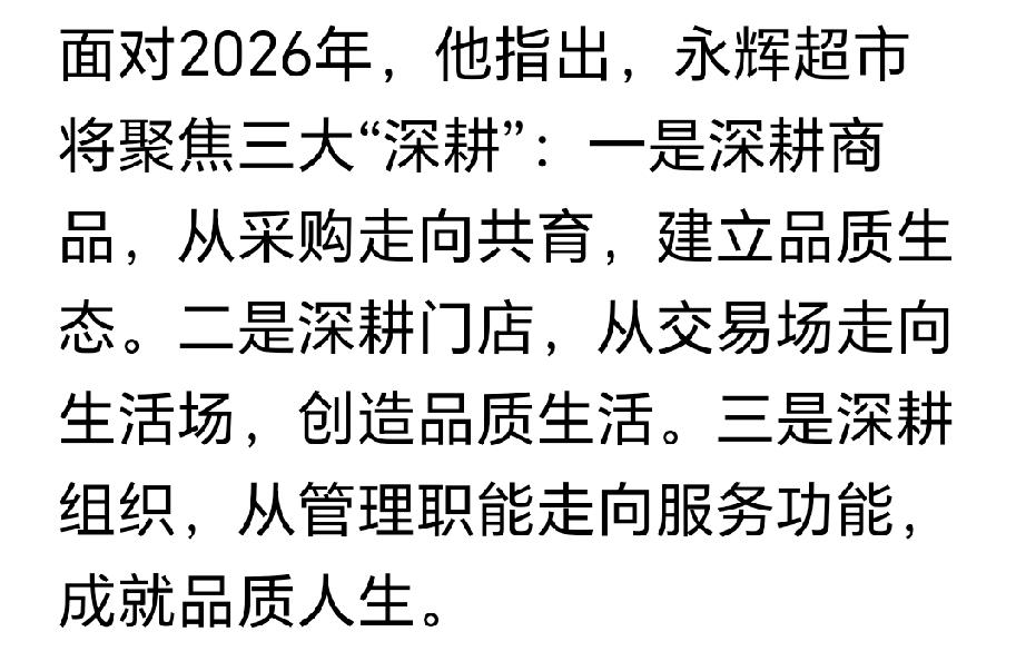 实话实说,在媒体上看到永辉CEO王守诚发表的新年全员信,其中对过去盲目的扩容进行了反思,认为是“欲望超过了能力”,这句话应该是对这些年永辉贪大最准确地表述,这也是我们常说的“大,并不代表你强”。 但接下来的2026年的三个“深耕”,好似又进入了语言新概念新口号的场境,作为普通的消费者,如果不好好琢磨琢磨,还真的不大能够看出这永辉在2026年,会有什么更大的变化。 永辉这两年借助胖东来之手,对旗下门店进行了大规模的关闭和调改,但其可能也只是从外在的形式上在模仿胖东来,而胖东来最简单的经营理念“品质加服务”,永辉并没有真正地去加以理解和真心地去学习。这三个“深耕”,除了新概念式的口号外,真的是看不到如何才能赢得消费者的信任来。