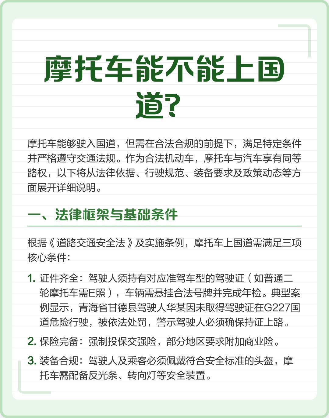 95后广东摩托车友骑行300公里返乡 又是一年春节返乡时节,有不少摩托大军骑行返乡,摩托车可依法驶入国道,但需满足合规条件并严格遵守交通法规。作为合法机动车,摩托车与汽车享有同等路权,具体规范如下:2026春运已进入返乡高峰