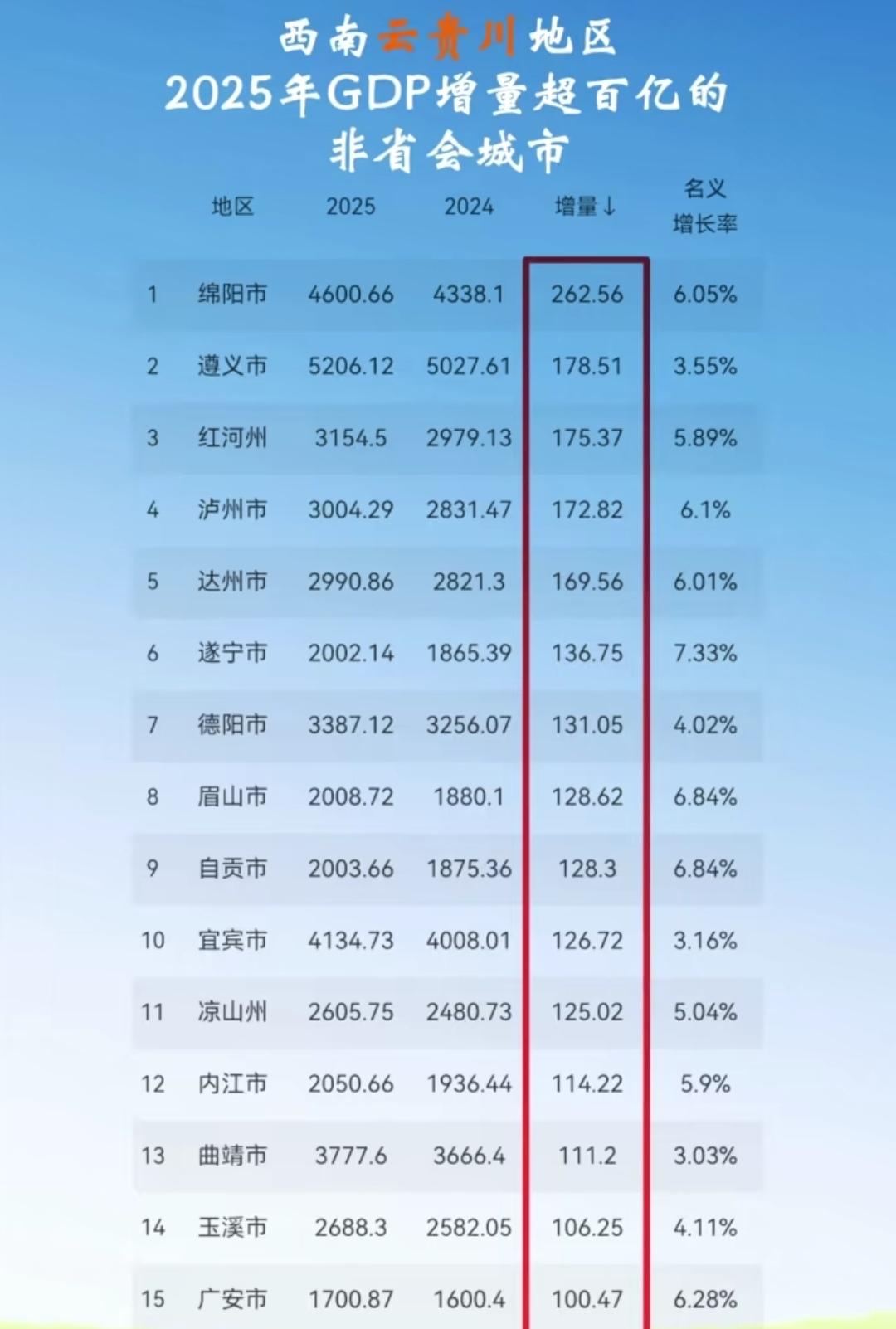 四川广安是唯一一个云贵川三省经济增长100亿以上总GDP还不足2000亿的城市!2025年云贵川三省经济增长100亿以上的15个城市(不含省会城市)只有广安市GDP不足2000亿,说明广安的经济体量还是很少还需要努力。