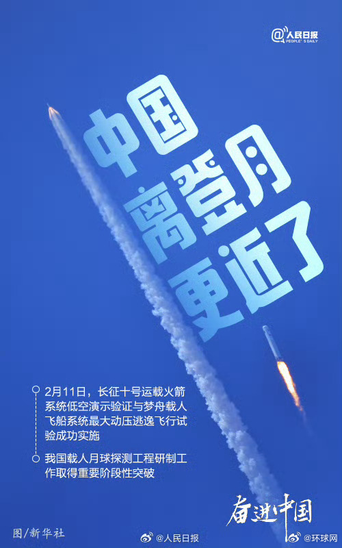 【骄傲转发!#中国离登月更近了#】2月11日,长征十号运载火箭系统低空演示验证与梦舟载人飞船系统最大动压逃逸飞行试验成功实施。此次试验标志着我国载人月球探测工程研制工作取得重要阶段性突破。#中国航天送上硬核新春礼物#↓↓#奋进中国#,加油! (人民日报)