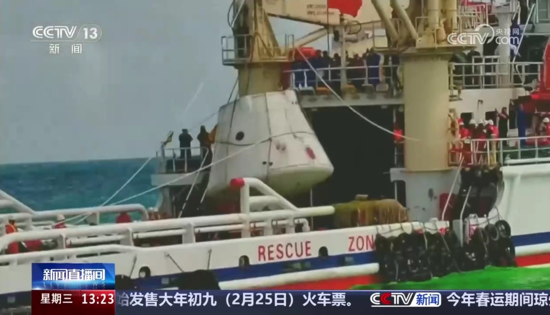 首次载人飞船返回舱海上搜索回收完成 打捞上来的梦舟飞船返回舱
