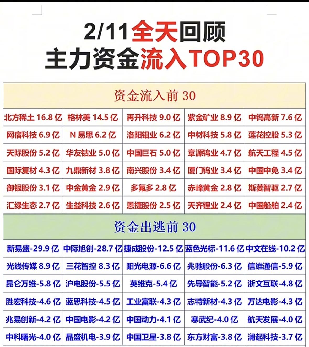 2/11 资金流向TOP30,投资参考! "主力资金动向:格林美、北方稀土等获大额流入,新易盛、中际旭创遭抛售,市场冷暖分明。"