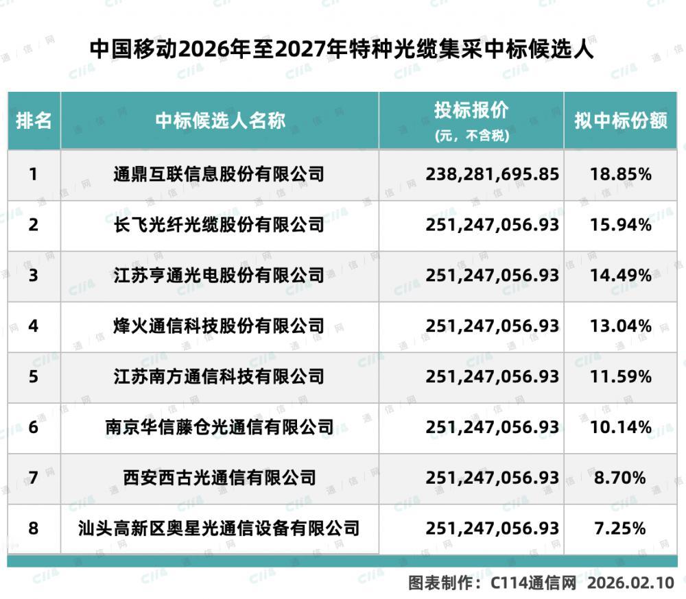 【价格暴涨,中国移动集采落地7家厂商‘顶格’报价】 中国移动日前完成2026-2027年特种光缆集采,通鼎互联、长飞、亨通光电等8家厂商中标。本次集采涵盖五大类特种光缆,规模约7.94万皮长公里(折合313万芯公里),项目设置最高限价2.5亿元。 值得关注的是,除第一名外,其余7家厂商的报价均“顶格”报至最高限价。这一集体行动与近期光纤市场价格迅猛上涨紧密相关。据行业调研,主流G.652.D光纤价格自2025年底启动上涨,2026年以来加速攀升,部分渠道价格已从长期低于20元/芯公里涨破50元。 本次集采公告发布于去年12月,正值涨价初期。分析认为,集采得以顺利落地,既是中国移动为保障供应链稳定、避免流标的务实考量,也体现了厂商在成本压力下的默契。作为年采购量超1亿芯公里的行业最大客户,中国移动的集采一直是光缆厂商至关重要的“基本盘”。