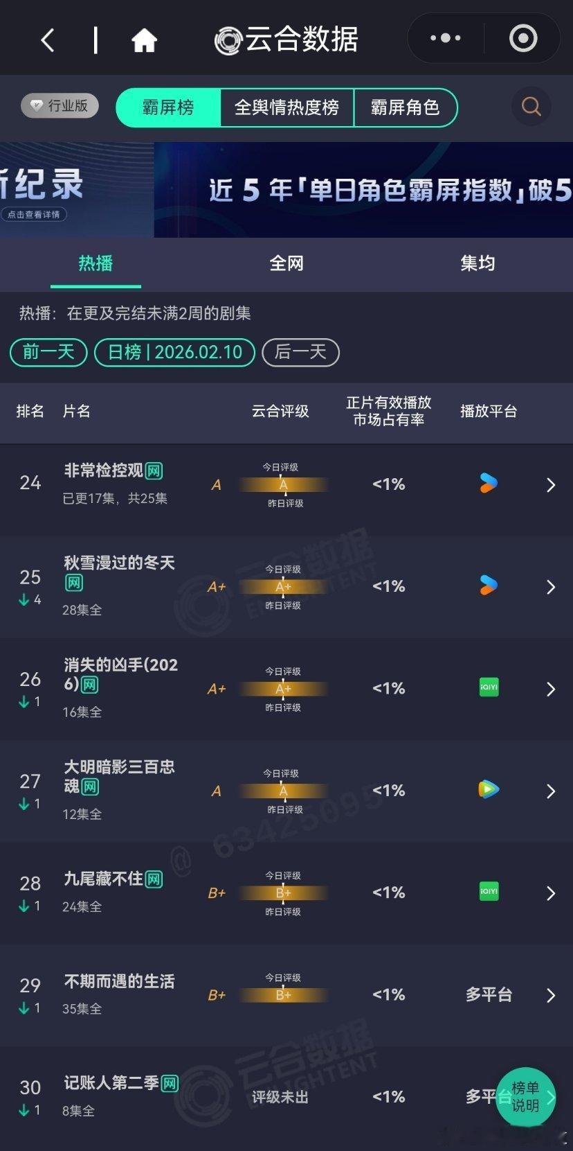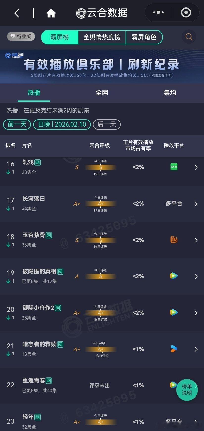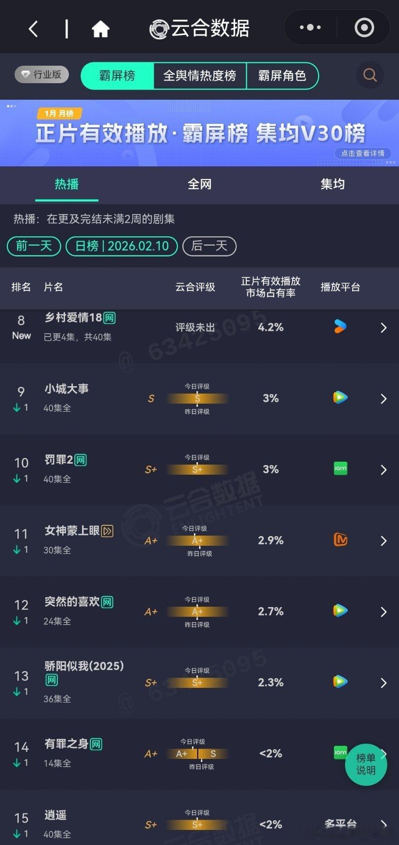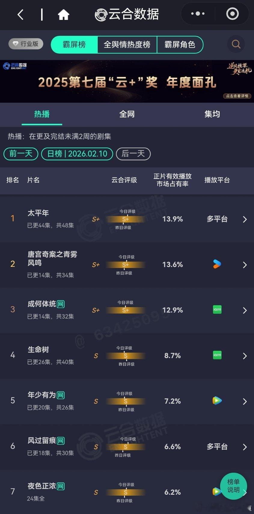 2月10日云合播放占比云合 太平年13.9%唐宫奇案13.6%成何体统12.9%评级S+生命树8.7%生命树 年少有为7.2%风过留痕6.6%乡村爱情18 4.2%厉害啊,没什么宣传还播得这么好。