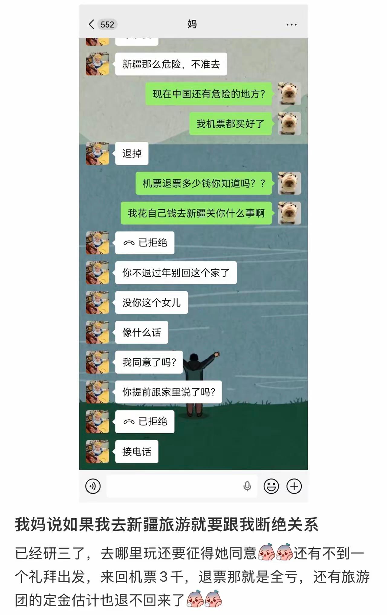 “敢去就断绝关系!”湖南一位研三女生在社交平台上发帖吐槽,自己马上要毕业出发去新疆旅游,妈妈却直接放狠话:“敢去就跟她断绝关系”。眼看还有不到一周就要启程,三千块来回机票退票几乎全亏,旅游团定金也大概率拿不回,这让她陷入两难,满心委屈又无奈。 有人觉得:“妈妈管得太严,孩子都研三了,该有自己的选择。”也有人理解:“父母的担心,新疆路途远、行程久,长辈难免牵挂安全。” 其实这件事,周少觉得说到底是两代人观念和边界感的碰撞。研三的孩子即将步入社会,渴望独立出行、看看世界,是成长里很正常的需求。 而父母的强硬阻拦,多半藏着没说出口的担忧,只是表达方式太过极端,这让女孩内心可能接受不了,又特别害怕。 与其激化矛盾,周少建议不妨试着多沟通,把行程规划、安全保障讲给父母听,慢慢消解他们的顾虑。成长从来不是对抗,而是学会在独立和亲情之间找到平衡。 父母的爱有时笨拙又强势,孩子的独立也需要温和表达,别让固执和狠话,伤了最亲近的人。 网友纷纷评论: 去过二次新疆的人告诉你,新疆放心大胆的去,没高反有美食,不要不经同意擅自进入人家牧场动人家东西,大多数当地人都友善的很!我打算夏天摩托车托运去伊犁,第三次去新疆摩旅新疆绝对是国内旅游的天花板。51岁大姐开巡航摩托,我的大宝贝。 我妈也是,我去哪儿她都不许,她觉得出去玩就是浪费钱,我大学老旷课出去玩,那时候出省漫游要单独开通,我妈就不许。 这个女孩是未与父母沟通的情况下,就自己决定去的,还说花自己钱,肯定是不对的,必仅前面是父母给的钱。