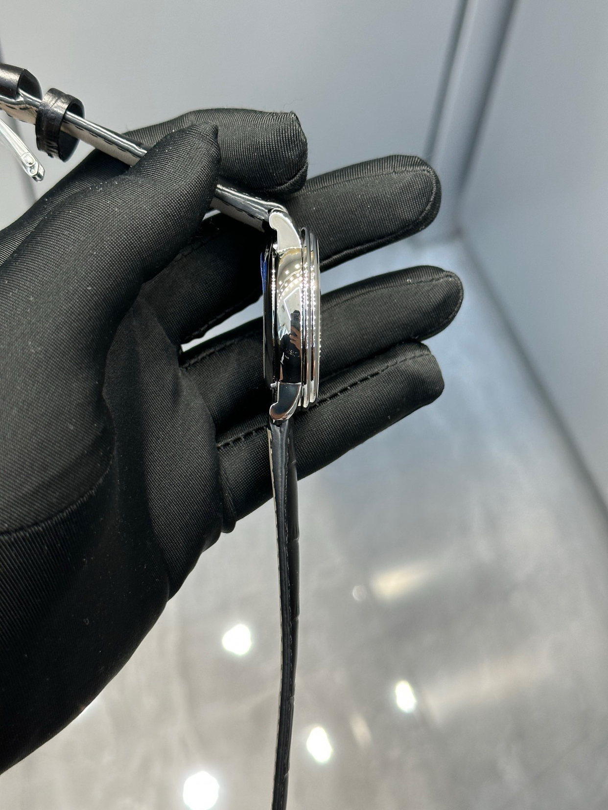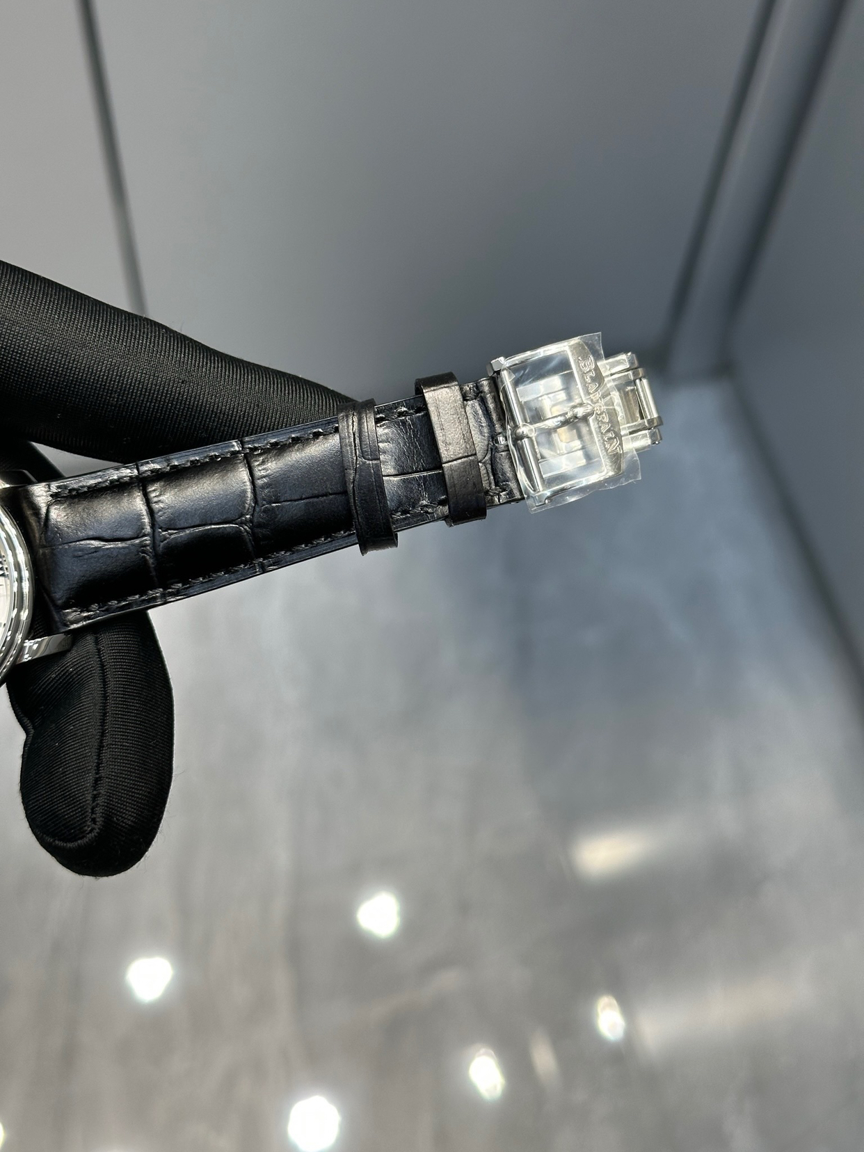 除了月相显示,6654还具备全历功能(日期、星期、月份),通过表冠和隐藏按钮即可轻松调校。鳄鱼皮表带提供了舒适的佩戴体验,无论是日常办公还是正式场合都能完美搭配。