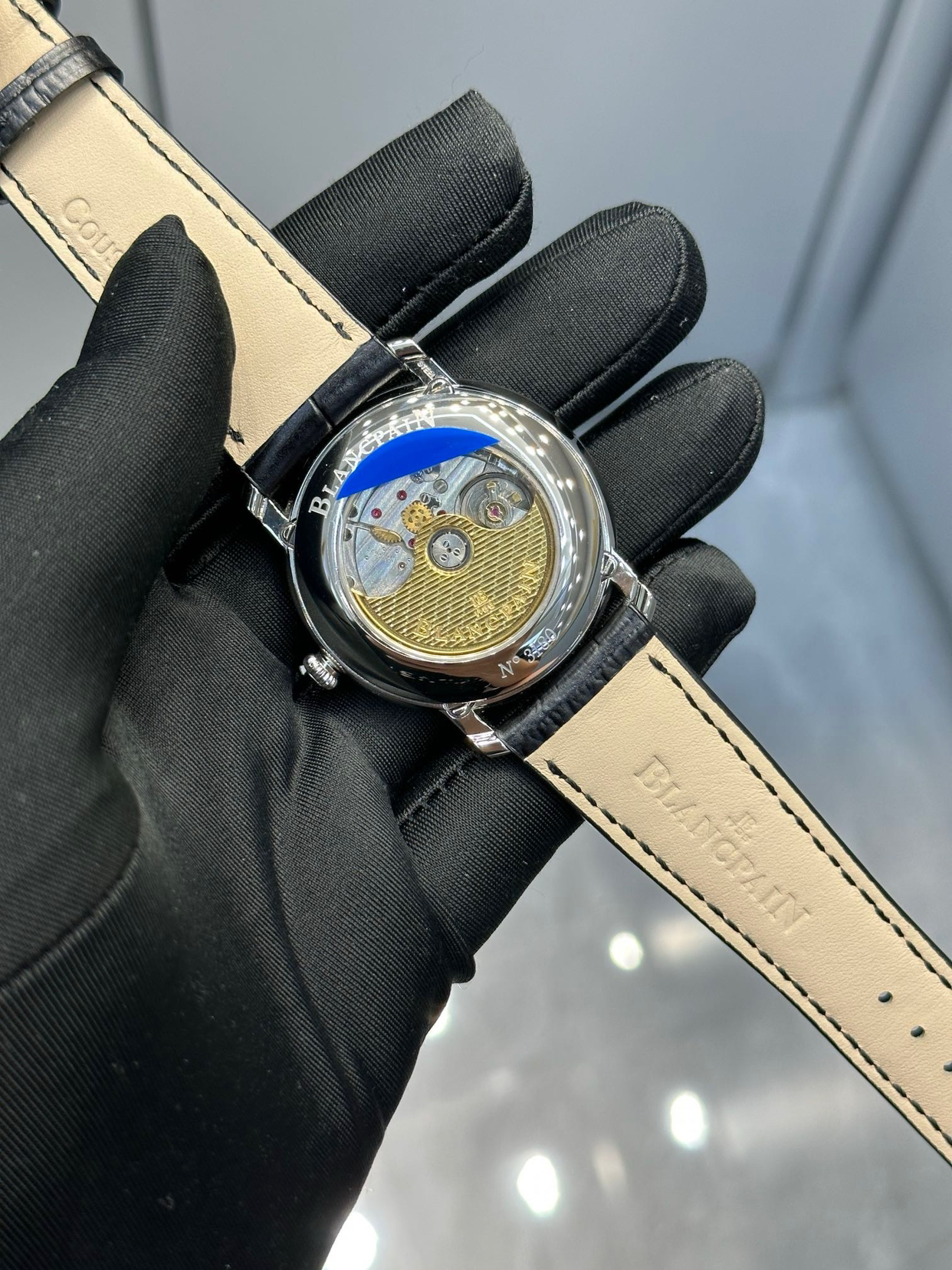 拿起宝珀6654,第一眼就会被它的平衡美学所吸引。40毫米表壳采用精钢或红金材质,圆润的线条延续了Villeret系列的经典风格。白色表盘上的罗马数字时标清晰易读,柳叶形指针优雅地划过表盘。