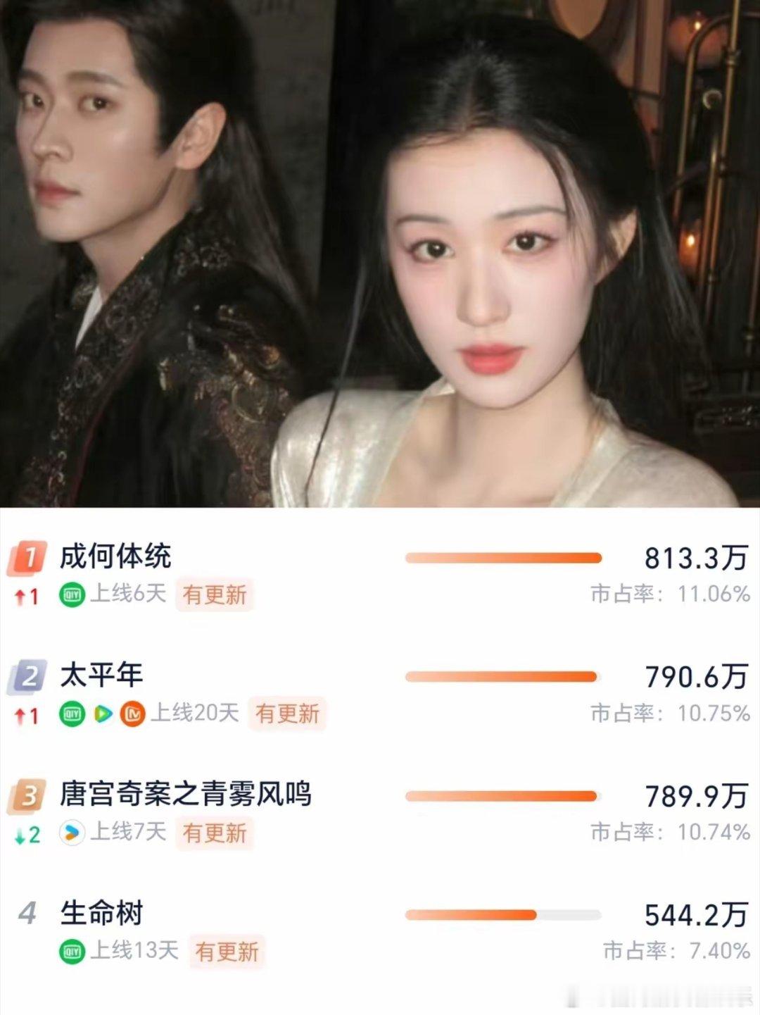 真是没想到这次打败杨紫的竟然不是白鹿和王星越,反而是太久没露面的王楚然和丞磊。《成何体统》虽然是穿越剧,但是这部剧的剧情和以往的穿越剧不太一样,主角也没有什么光环。而且丞磊和王楚然很搭,男帅女美,对追剧党的眼睛特别友好。这部剧的热度和播放量也很高,不仅超越了白露和杨紫的剧,现在竟然连太平年都超越了。看来观众不是看腻了古偶剧,只是剧情为王罢了。
