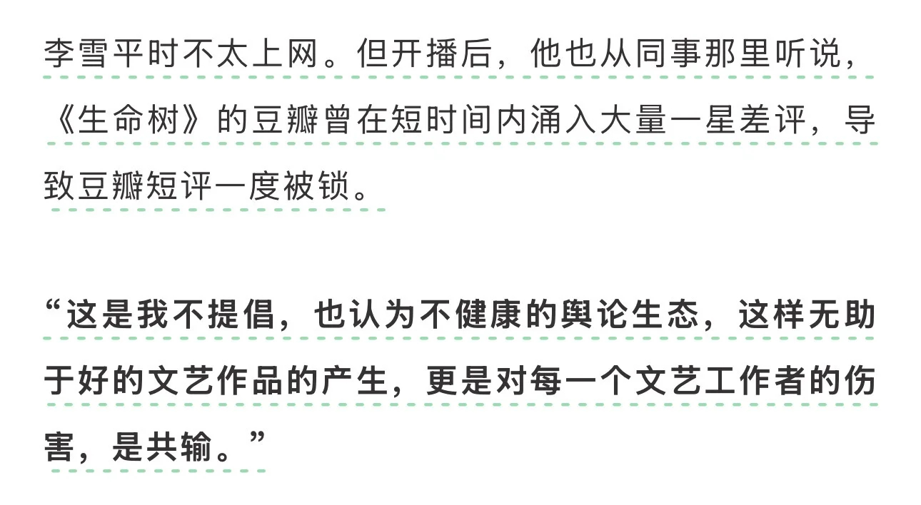 《生命树》导演李雪接受采访认为豆瓣开播一星差评都是对文艺工作者的伤害