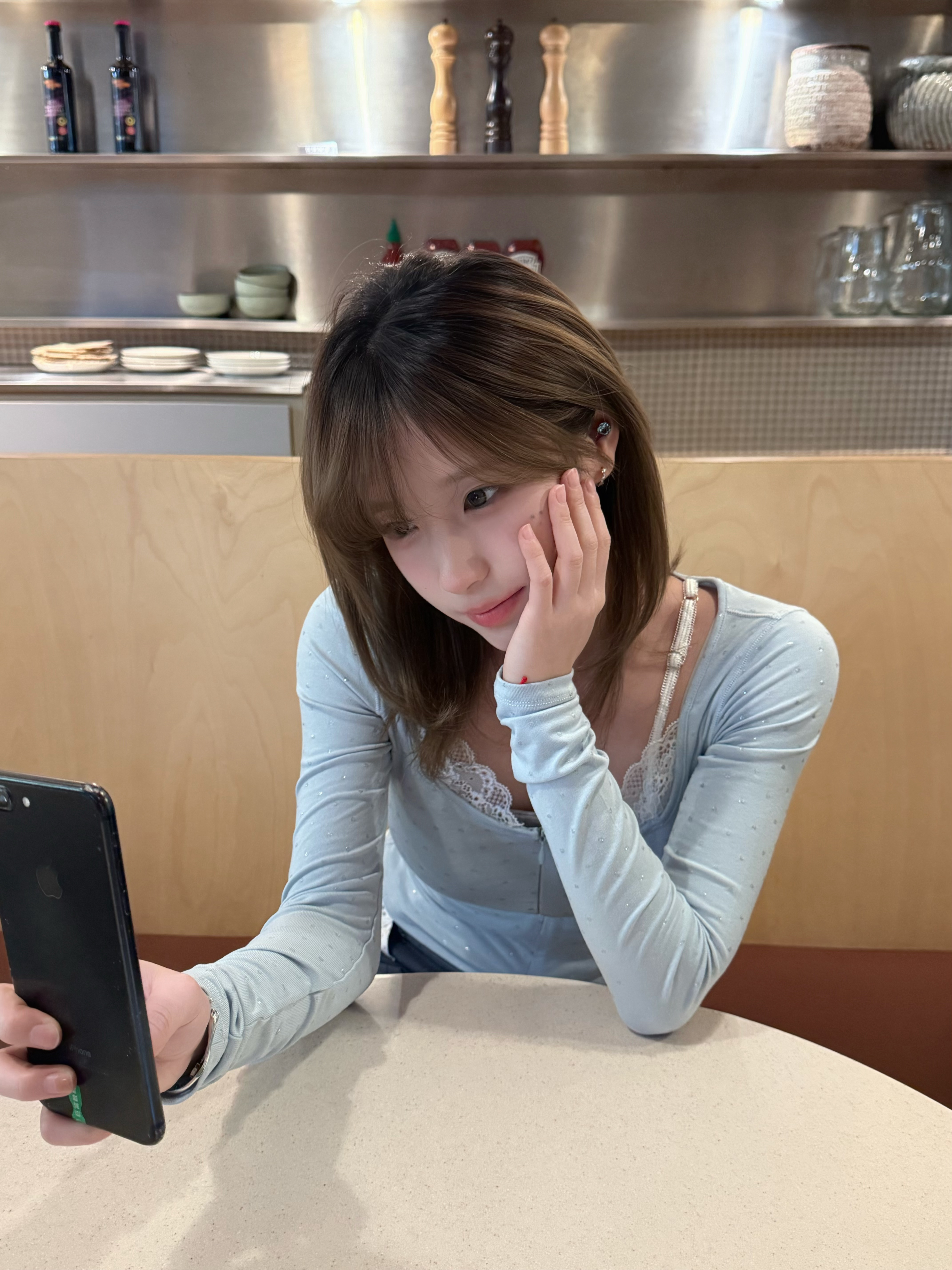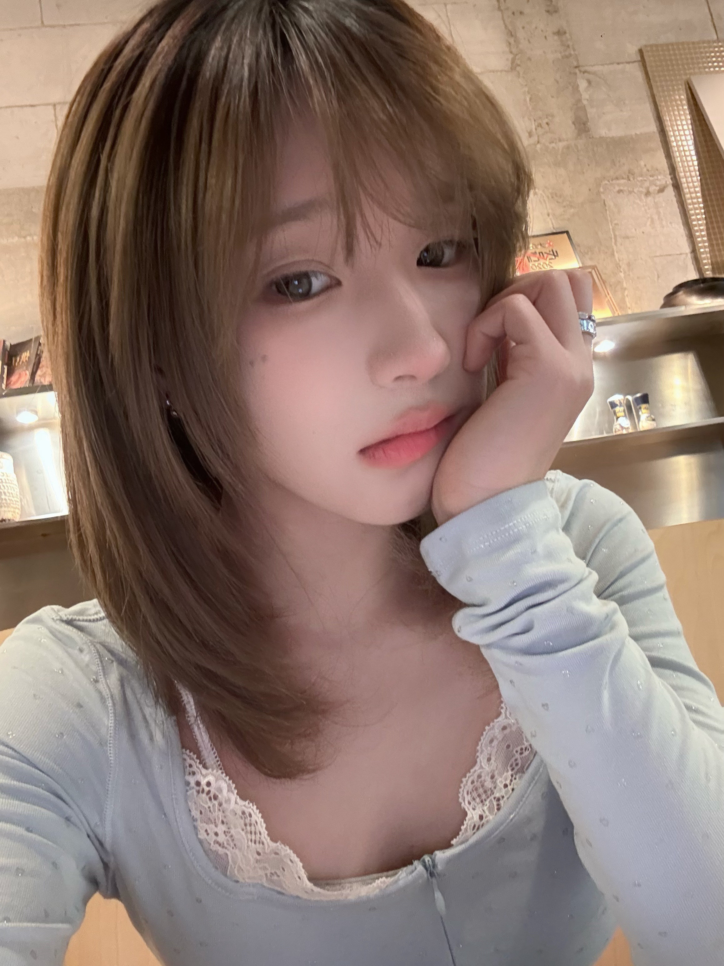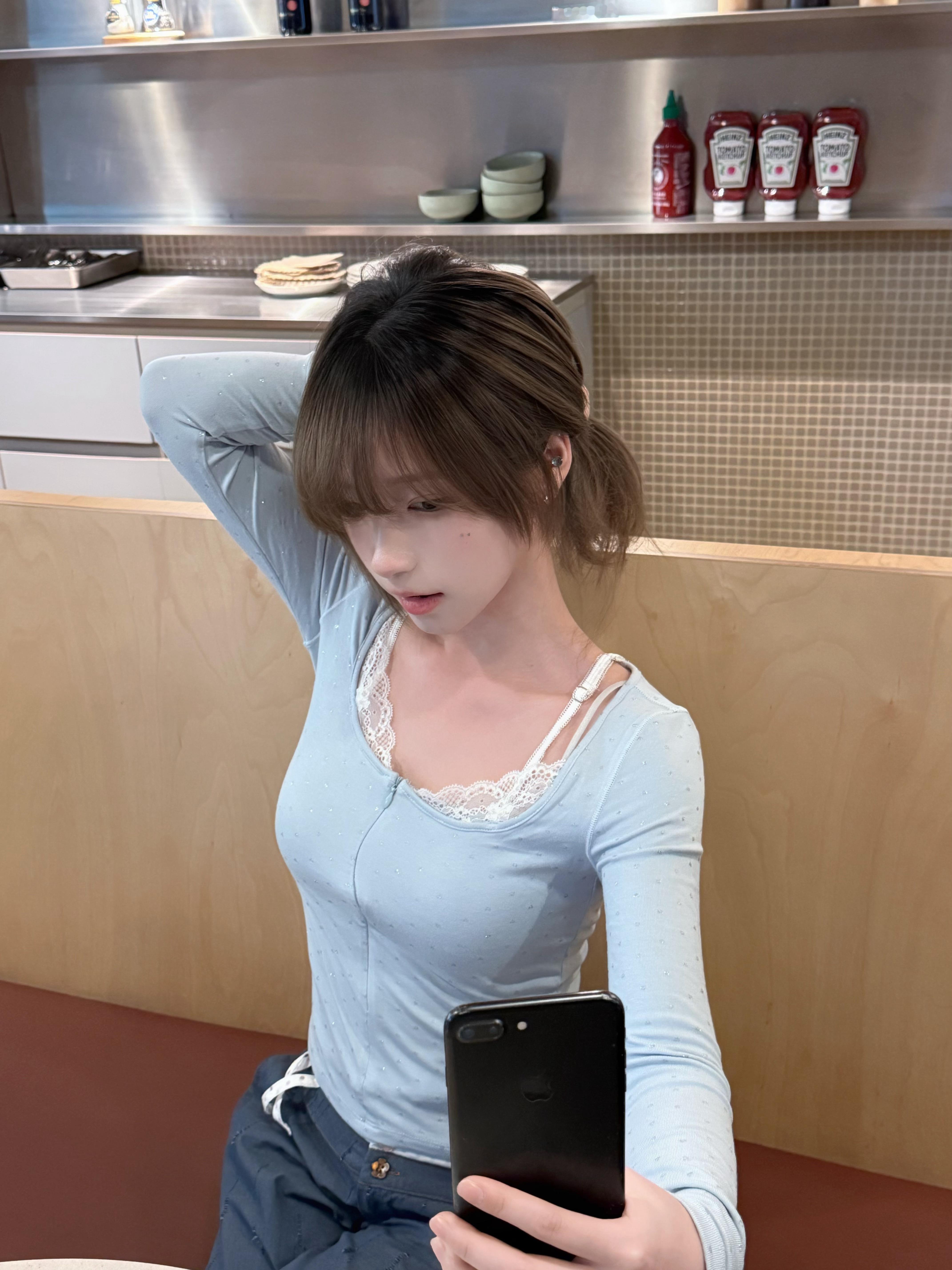 偶尔蓝色上衣 ariseism裤子 朋友的(不知道是啥牌子)发色 冷棕色眼珠 氧气灰拍摄 苹果16pm 中性色调