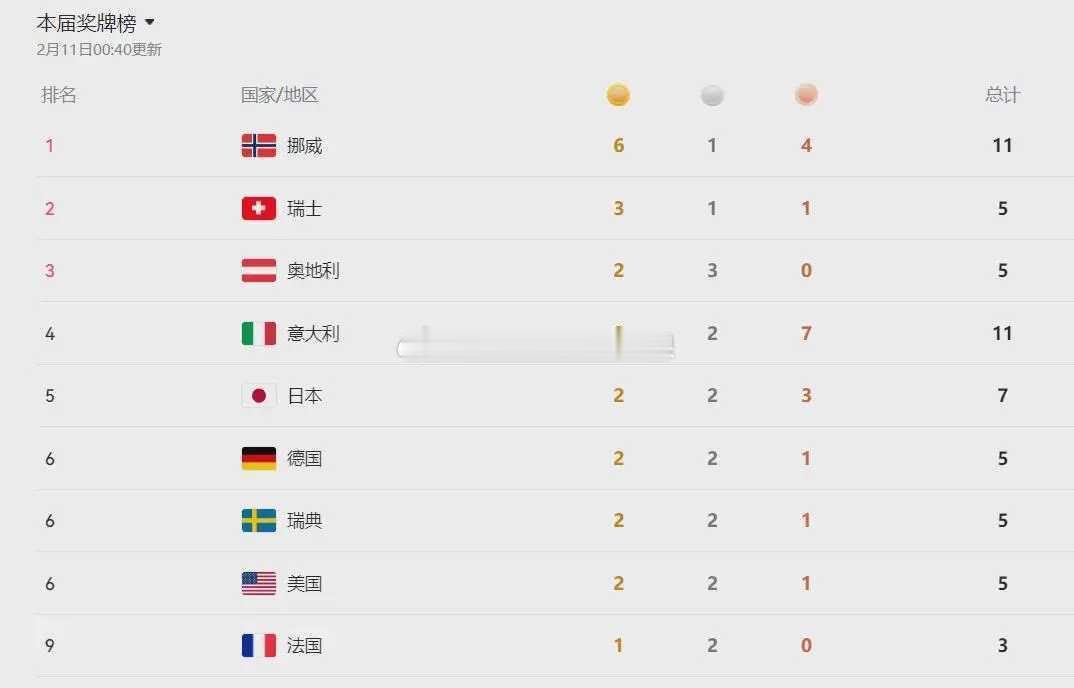 冬奥会最新奖牌榜 冬奥会最新奖牌榜,挪威第1瑞士第2,中国队遗憾丢夺金点,排第13米兰冬奥会已经开始有几天的时间了,每一天里各个比赛都在照常进行着。按照北京时间来算,米兰冬奥会已经来到第5天了。那么,截至第5天结束,奖牌榜是什么样的情况呢?下面来一起看一看吧。第一名,挪威,6枚金牌1枚银牌4枚铜牌,合计11枚奖牌;第二名,瑞士,3枚金牌1枚银牌1枚铜牌,合计5枚奖牌;第三名,奥地利,2枚金牌3枚银牌0枚铜牌,合计5枚奖牌。