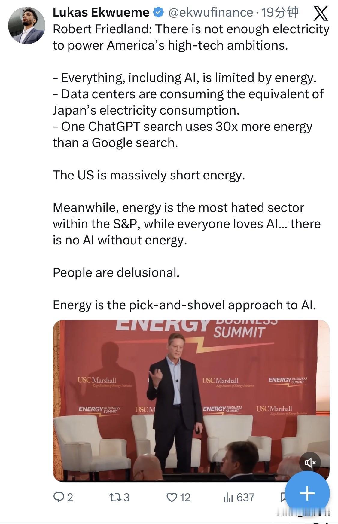 艾芬豪矿业(Ivanhoe Mines)的创始人兼执行联席董事长罗伯特·弗里德兰分享了自己的观点:美国的电力供应不足以支撑其高科技雄心。 包括人工智能在内的一切事物都受到能源的限制。 数据中心消耗的电量相当于日本的全国用电量。 - ChatGPT 一次搜索消耗的能量是 Google 搜索的 30 倍。 美国能源严重短缺。 与此同时,能源是标普500指数中最不受欢迎的板块,而每个人都喜欢人工智能……但没有能源就没有人工智能。 人们都活在幻想中。 能源领域就像是用镐和铲子来开发人工智能。