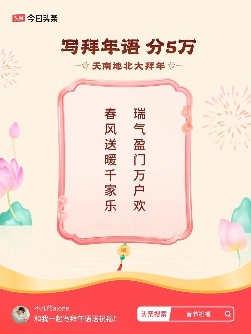 写拜年语送祝福新春拜年送祝福!我的祝福是:“春风送暖千家乐,瑞气盈门万户欢”!快来一起写祝福吧戳这里,一起领红包>