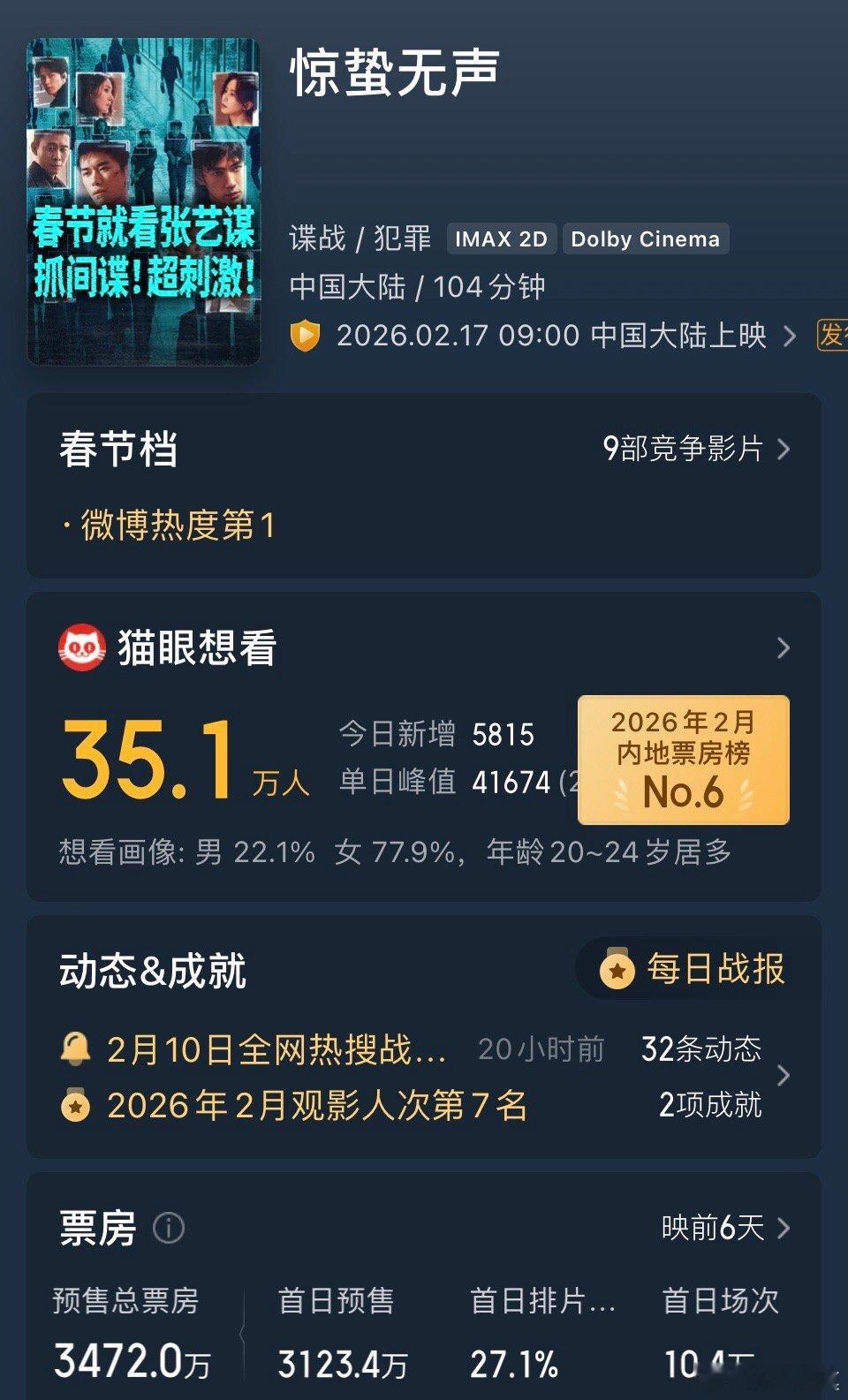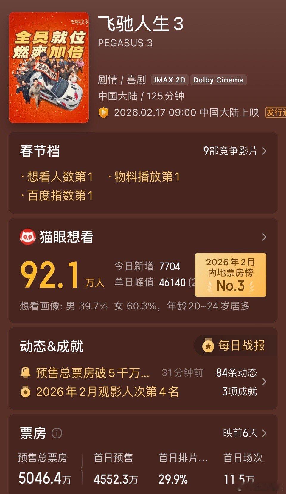 《飞驰人生3》预售票房破5000万。《惊蛰无声》3600多万紧随其后。《镖人》暂列第三,目前预售票房为2400万。飞驰人生3预售票房破5000万