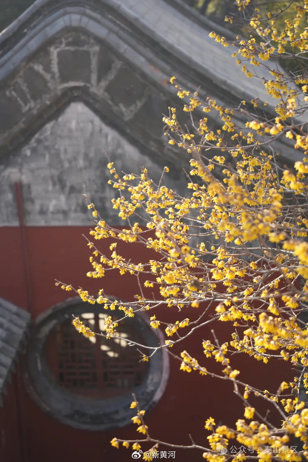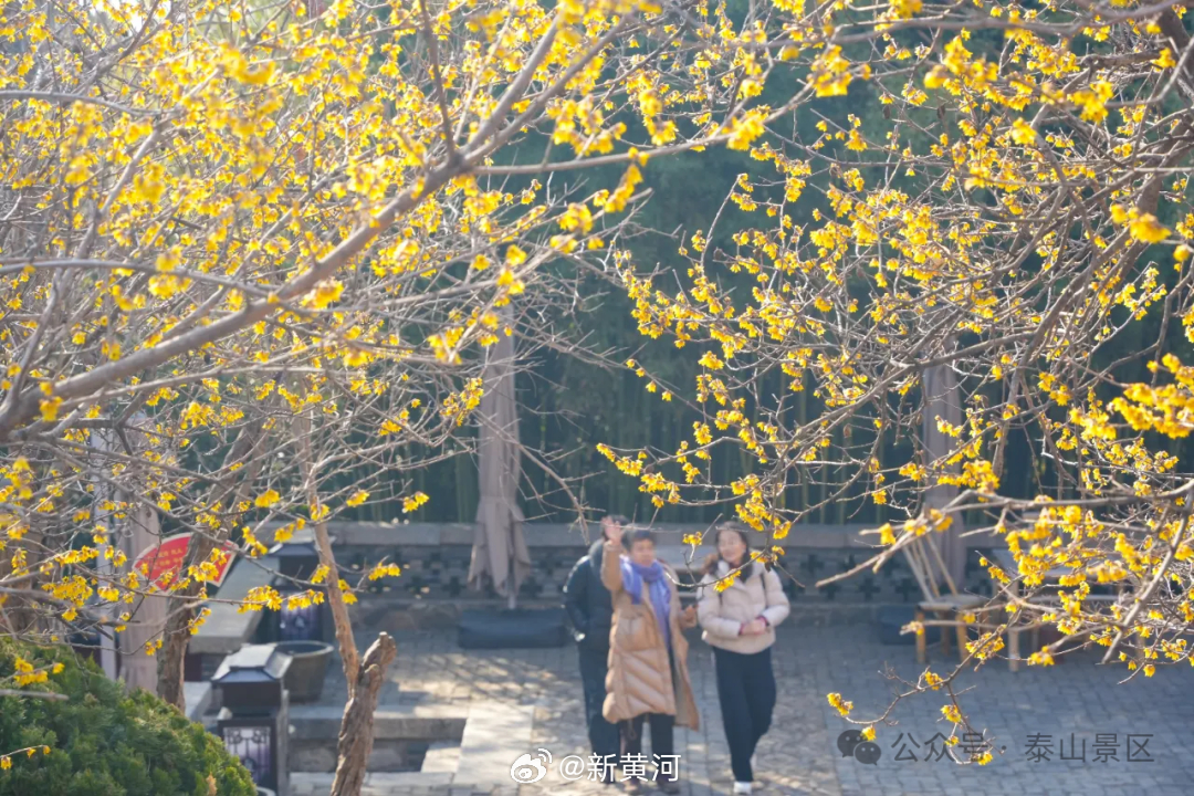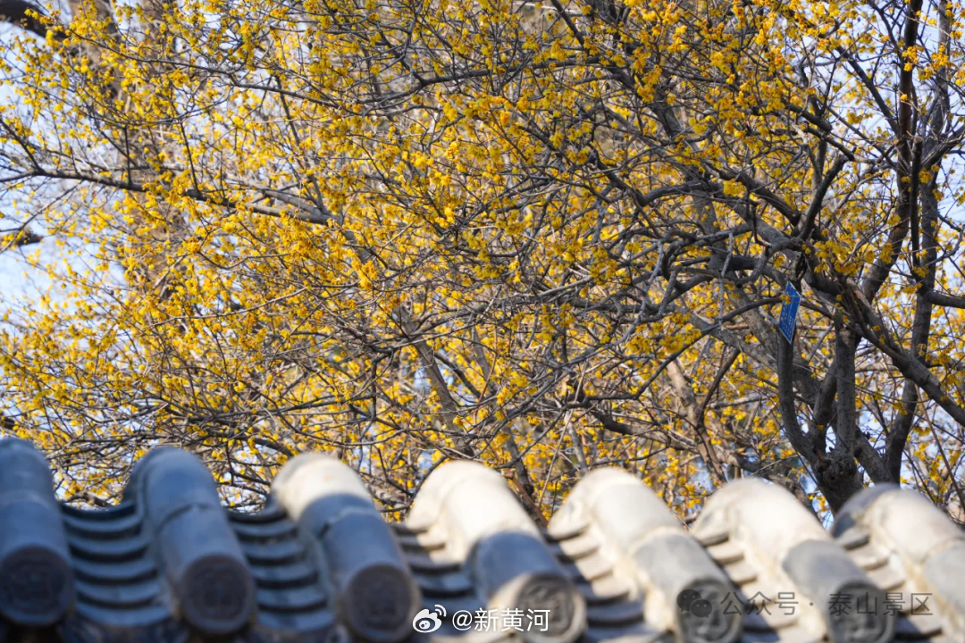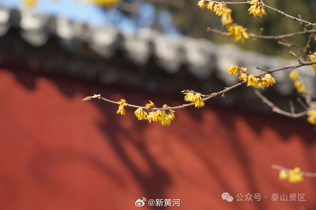 【#泰山蜡梅进入盛放期#】岁末冬深,新春将近,泰山脚下,蜡梅已进入盛放期。漫山松柏凝翠,山下蜡梅吐蕊,金黄点点缀于枝头,暗香浮动随风漫过山峦,为巍峨岱宗添上了一抹温柔诗意。山下古寺旁、步道边、庭院中,花枝轻摇,连普照寺内的蜡梅也花开正盛,红墙映金蕊,古意与花香相融,成为初春泰山一道别致的风景。(泰山景区)