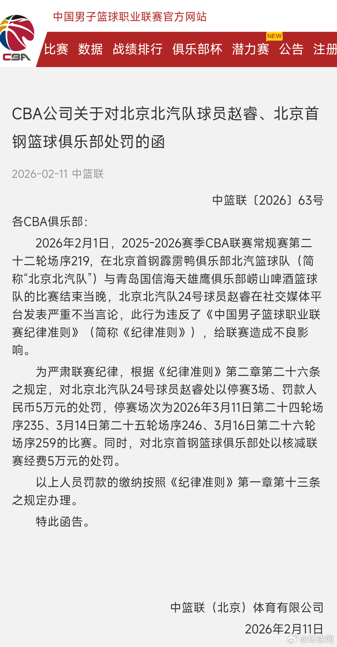 为严肃联赛纪律,根据《纪律准则》第二章第二十六条之规定,对北京北汽队24号球员赵睿处以停赛3场、罚款人民币5万元的处罚,停赛场次为2026年3月11日第二十四轮场序235、3月14日第二十五轮场序246、3月16日第二十六轮场序259的比赛。同时,对北京首钢篮球俱乐部处以核减联赛经费5万元的处罚。