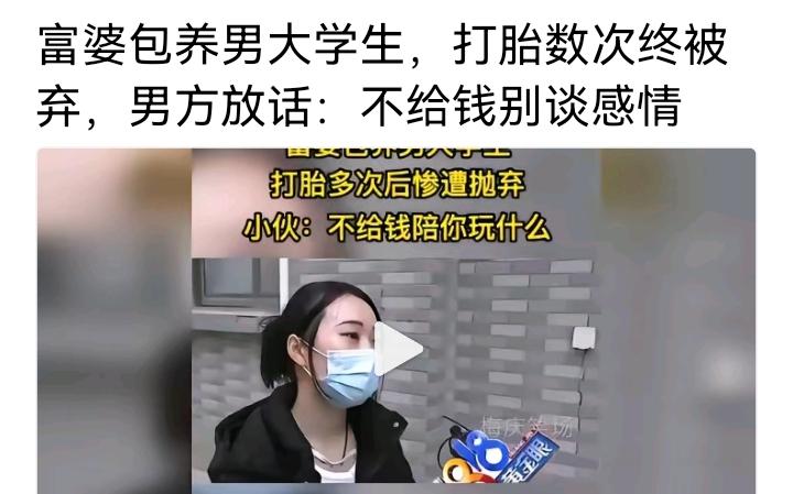 富婆包养男大学生,多次打胎后被弃:“不给钱,别谈感情” 女子以为是真爱,没想到只是一场交易。 女子和男生是在一次酒局上认识的,他是名牌大学的学生,年轻又帅气。我被他的活力吸引,主动提出包养他,每个月给他几万块零花钱。 我以为用钱能买来陪伴,却没想到,买来的只有算计和伤害。 女子怀孕了三次,每次他都以“还在读书,不适合要孩子”为由,让女子去打胎。女子一次次妥协,幻想着等他毕业,我们就能有未来。 可当女子第四次怀孕,想留下这个孩子时,他却彻底翻脸:“不给钱,陪你玩什么?” 原来,男生从一开始就没爱过女子。他接近女子,只是为了钱。当女子失去了利用价值,男生就毫不犹豫地把女子抛弃。 女子现在才明白,用金钱堆砌的关系,终究抵不过现实的残酷。真心错付的代价,太痛了。 社会百态 包养的爱情 包养小伙