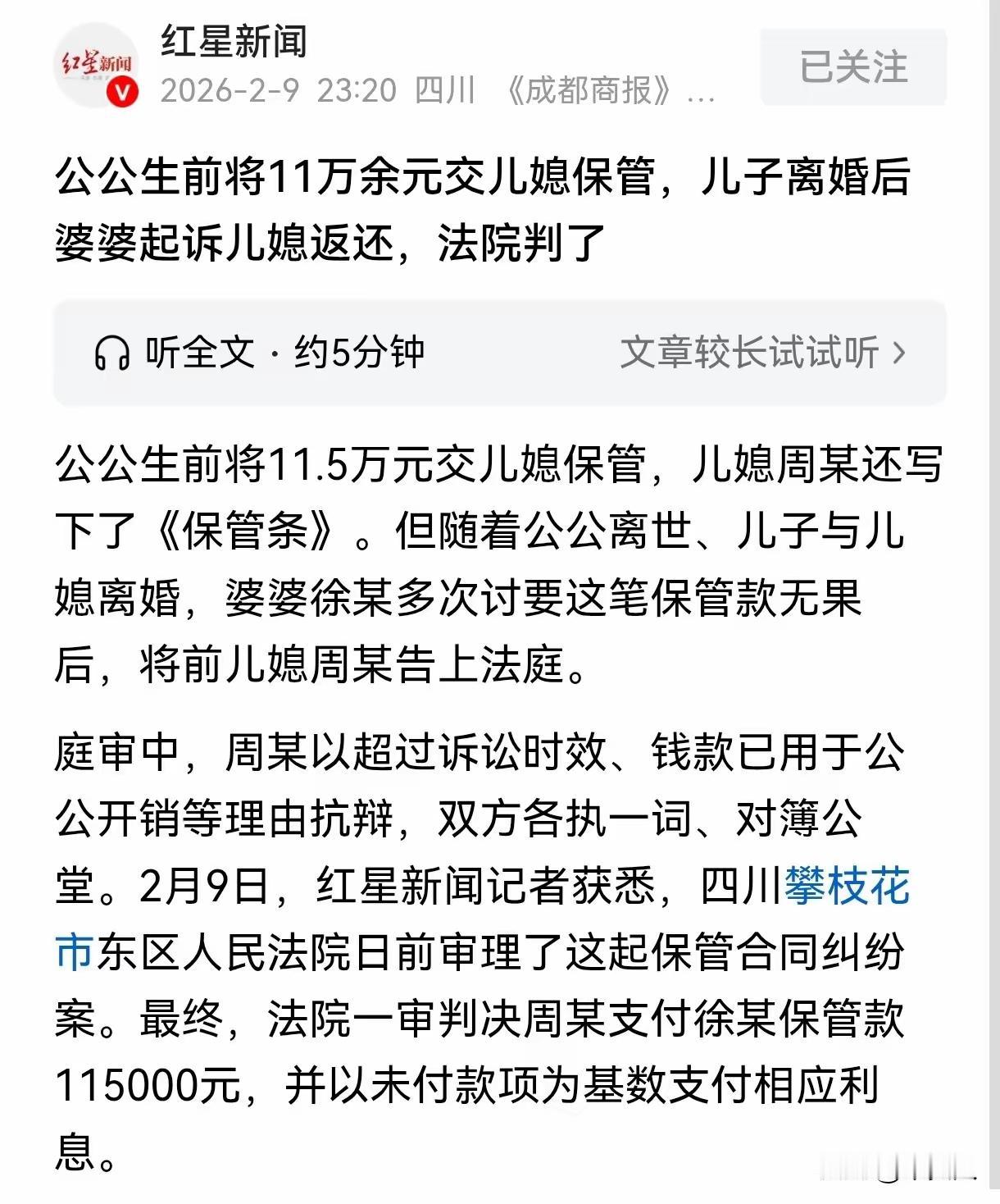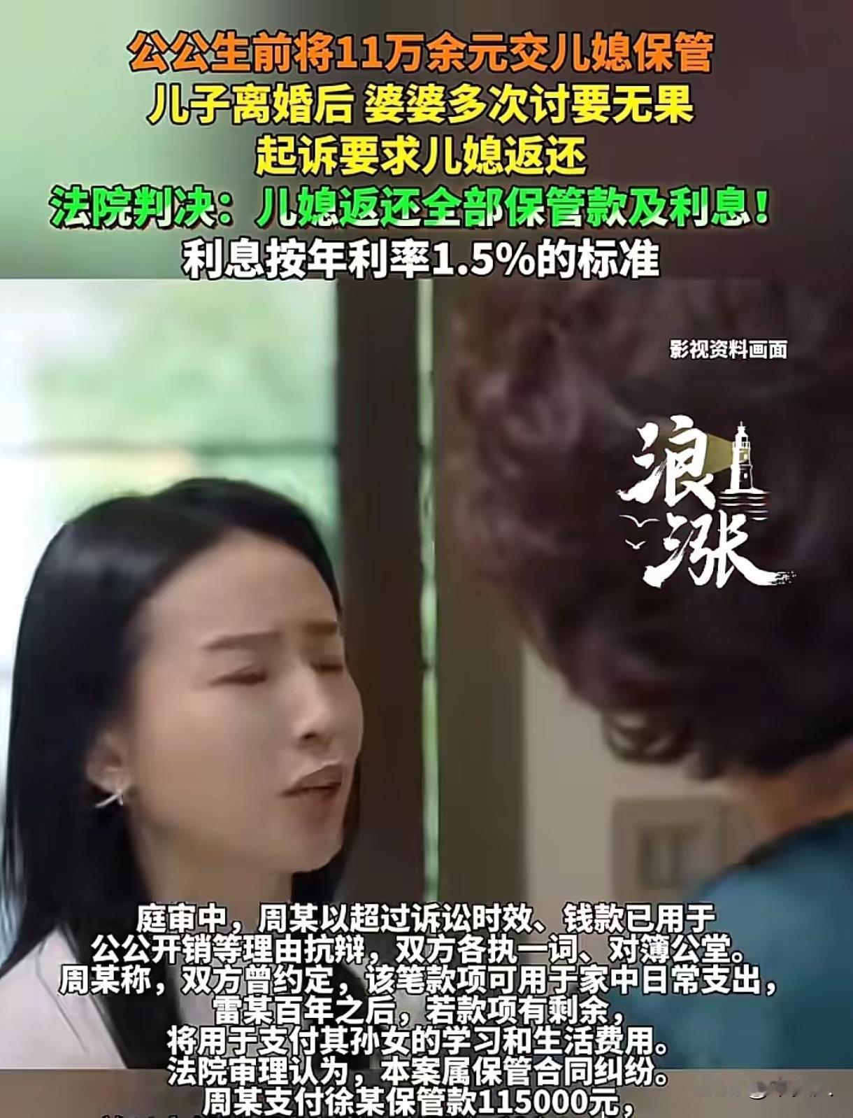 “儿媳保管公公11.5万,8年后拒还称‘已花光’!法院判决一出,全网炸锅!” 在四川攀枝花,一场因11.5万元存款引发的家庭纠纷,近日被推上舆论风口浪尖。一位老人临终前将毕生积蓄交由儿媳保管,本以为是托付信任,却没想到这笔钱竟成了日后撕裂亲情的导火索。更令人唏嘘的是,当儿子儿媳离婚后,前婆婆一纸诉状将前儿媳告上法庭,要求归还全部本金及利息。而前儿媳却坚称:“钱早就花完了,而且诉讼时效早过了!”这场看似普通的家庭财产纠纷,背后却牵扯出法律、道德与亲情的多重博弈。 事情要从2017年说起。当时70多岁的雷大爷,出于对儿媳周某的信任,将自己辛苦积攒的115000元现金亲手交给她,并要求她代为保管。为了让老人安心,周某当场写下一张《保管条》,白纸黑字写明:“今替老爷子雷某某保管现金115000元,存入银行,每年利息送入老人手中。”这张纸条,既是承诺,也是契约。 雷大爷心想,钱放在自家人手里,总比存在银行更放心。可谁也没想到,2020年6月,雷大爷因病去世,这笔钱却再未回到家族手中。周某既未主动归还,婆家也未及时追讨,一家人表面平静地继续生活了四年之久。 转折发生在2024年7月——周某与丈夫感情破裂,正式离婚。婚姻关系的终结,也让原本被掩盖的矛盾浮出水面。雷大爷的遗孀徐大妈手持那张泛黄的《保管条》,多次上门要求周某归还11.5万元。她态度坚决:“这钱是我老伴的遗产,你只是保管人,不是受益人!” 面对婆婆的追讨,周某却毫不退让。她提出两大抗辩理由:第一,这张《保管条》写于2017年,距今已近8年,早已超过《民法典》规定的3年诉讼时效;第二,这笔钱并非“原封不动”地存放,而是按照老人当年的口头约定,用于家庭共同开销——比如她曾带公公外出旅游花费4000多元,还分两次给了老人3000元“利息”,甚至老人曾亲口说“剩下的钱留给孙女读书用”。 为了佐证自己的说法,周某还拿出一本手写的账本,详细记录了各项支出。然而,徐大妈对此嗤之以鼻:“这些全是她自己写的,我老伴从未签字确认,凭什么作数?” 案件进入法院审理阶段后,焦点迅速集中在三个关键问题上:是否存在有效保管合同?诉讼时效是否已过?所谓“家庭开支”是否真实合法? 法院经审理认为,《保管条》虽未注明归还日期,但明确表达了“保管并返还”的意思,符合《民法典》第888条关于保管合同的定义——即“保管人保管寄存人交付的保管物,并返还该物的合同”。因此,雷大爷与周某之间确实构成合法有效的保管合同关系。 至于诉讼时效,法院指出:由于《保管条》未约定具体返还时间,根据法律规定,寄存人可随时要求返还。因此,徐大妈在2024年提起诉讼,并未超过3年时效。周某所谓“8年已过期”的说法,完全站不住脚。 更关键的是,周某提供的所谓“开支记录”,既无雷大爷签字,也无银行转账、收据等客观证据支撑,纯属单方陈述。法院依法不予采信。而所谓“老人口头承诺赠与孙女”的说法,同样缺乏证据支持。在法律面前,口头承诺若无佐证,难以对抗书面合同。 最终,法院作出判决:周某须向徐大妈返还115000元本金。关于利息部分,虽然《保管条》提到“每年利息送入老人手中”,但未明确利率标准。法院综合考虑实际情况,参照近年来银行一年期定期存款平均利率1.5%,判令周某支付自2017年1月1日起至实际清偿之日止的利息。经核算,本息合计约13万余元,远低于徐大妈最初主张的151944元。 值得一提的是,雷大爷的一双儿女作为法定继承人,均书面声明放弃继承权,同意将全部款项归母亲徐大妈所有。这也让判决执行更为顺畅。 此案一经曝光,迅速在社交平台引发热议。有网友怒斥:“把公公的钱当成自己的小金库,良心不会痛吗?”也有人理性分析:“保管≠赠与,法律必须守住底线。”更有法律人士指出,此案具有典型意义——它提醒所有家庭:涉及大额财物交接,务必保留书面凭证,避免“信任变纠纷”。 事实上,在老龄化社会加速到来的今天,类似“老人托付子女或儿媳保管存款”的情况屡见不鲜。但亲情不能替代法律,信任更需制度保障。若无明确约定,一旦家庭关系破裂,极易引发不可调和的矛盾。 雷大爷或许至死都相信,儿媳会善待他的积蓄。但他没想到,信任一旦被辜负,连骨灰未寒之际,都可能成为他人争利的筹码。而法院的判决,不仅维护了法律尊严,也为无数家庭敲响警钟:亲情可贵,但规则更不可缺。 如今,周某是否已履行判决尚不得而知,但这场官司留下的教训,值得每个家庭深思。毕竟,金钱可以计算,但亲情一旦破碎,便再难复原。存款老人去世 已故的婆婆