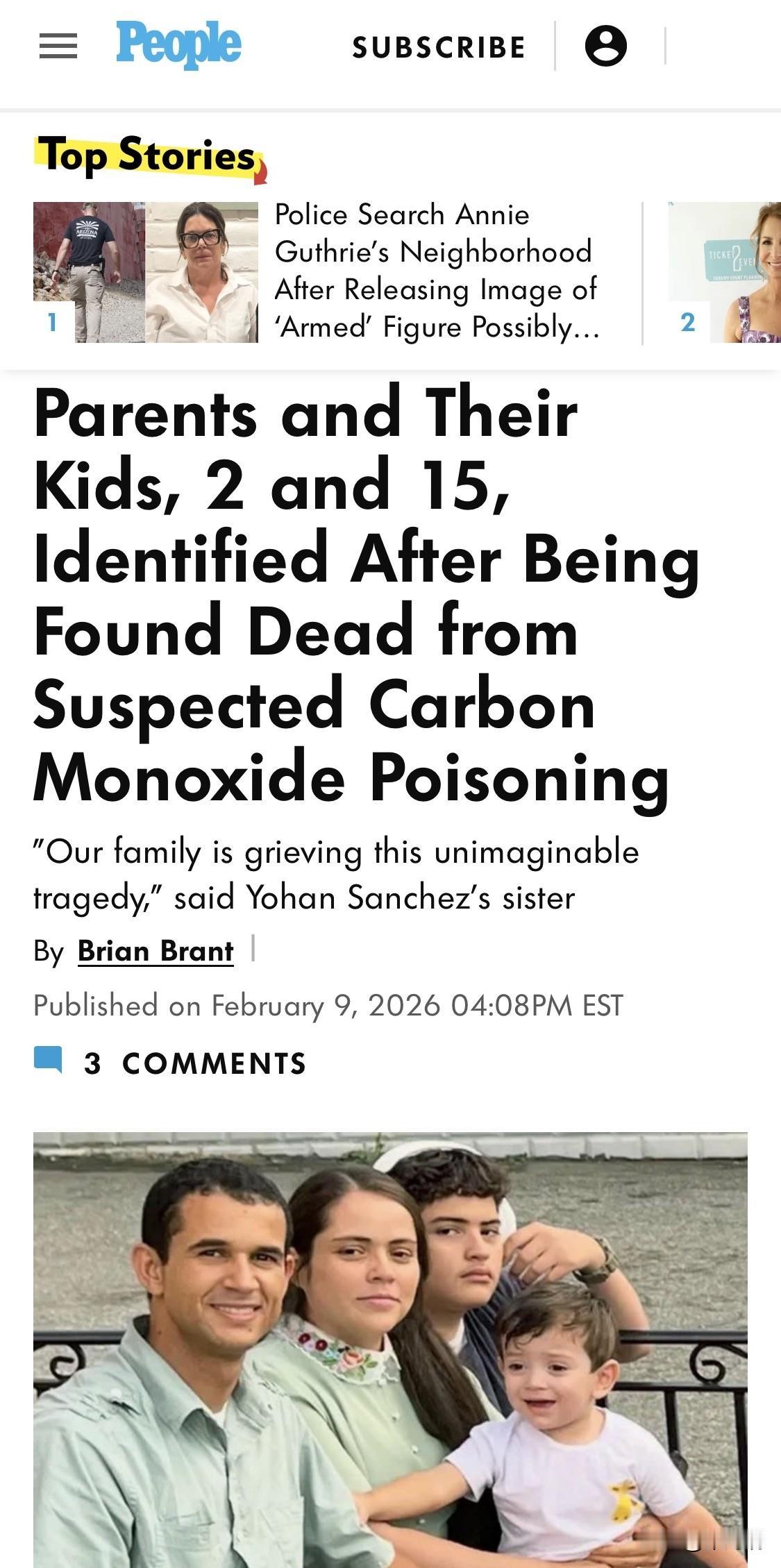 2026年2月6日,美国海岸警卫队的一名成员及其家人被发现死于佛罗里达州奥卡拉(Ocala)的家中,初步调查显示疑似死于一氧化碳中毒。 事发经过:马里恩县警长办公室 (Marion County Sheriff's Office) 于2月6日晚约10:25接获家属和教会牧师的报案进行福利检查(welfare check),发现一家四口已在位于 Banyan Track Way 的家中死亡。 受害者身份: Yohan Sanchez(33岁):美国海岸警卫队成员(曾任预备役人员,近期从事卡车司机工作)。 Rebeca Santos(37岁):Yohan 的妻子。 Michael Melendez(15岁):两人的长子,九年级学生。 Samuel Sanchez(2岁):两人的幼子。 死因调查:现场环境及遗体状况显示疑似一氧化碳中毒。目前未发现他杀迹象(no foul play),正式死因仍需等待法医的尸检报告。 邻居和教会成员称这一家人非常友好且活跃于社区,因 Michael 未按计划于周四晚在教会讲道,引起了牧师的警觉并报警。