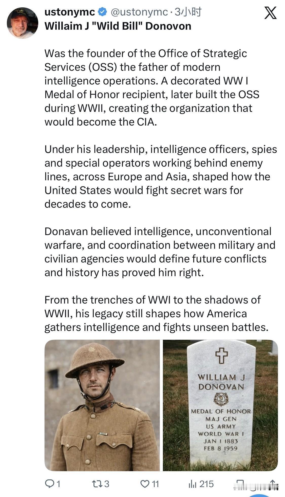 威廉·J·“狂野比尔”·多诺万(William J. "Wild Bill" Donovan,1883年1月1日 – 1959年2月8日)是美国历史上最具传奇色彩的情报官员、军人和律师。他被公认为“中央情报局之父”(Father of American Intelligence),是二战期间美国战略情报局(OSS,CIA的前身)的创始人及负责人。 核心成就与地位 情报界奠基人:他在二战期间受富兰克林·罗斯福总统委托,建立了美国第一个中央化的情报机构 Office of Strategic Services (OSS)。 勋章获得者:他是美国历史上唯一一位同时获得过国家四大最高勋章的人:荣誉勋章(Medal of Honor)、杰出服务十字勋章、杰出服务勋章和国家安全勋章。 绰号由来:在第一次世界大战中,由于他在训练和战斗中表现出的勇猛和不屈不挠的精神,部下送他绰号“狂野比尔”(Wild Bill)。 职业生涯概况 早期教育与法律:毕业于哥伦比亚大学法学院(1907年),与罗斯福总统曾是同学。 一战表现:作为“战斗的爱尔兰人”第69团的指挥官在法国作战,因在默兹-阿贡攻势中的英勇表现获得荣誉勋章。 政商界经历:战后在华尔街从事律师业务,曾出任美国助理司法部长(1924-1929)。 二战与OSS:1942年被任命为战略情报局局长,领导了大量敌后渗透、破坏和心理战行动。 晚年:战后曾担任纽伦堡审判的特别助理检察官,并于1953-1954年担任美国驻泰国大使。 他的雕像目前矗立在位于弗吉尼亚州兰利的CIA总部大厅中,以纪念他对现代美国情报体系的卓越贡献。