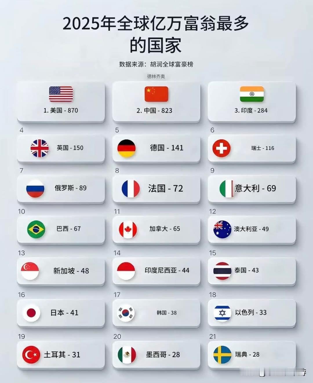 全球TOP 20 GDP排行榜中,中国排行第二。 此外,全球亿万富豪人数排行榜中,中国也是第二! (数据源自网络,仅供参考)