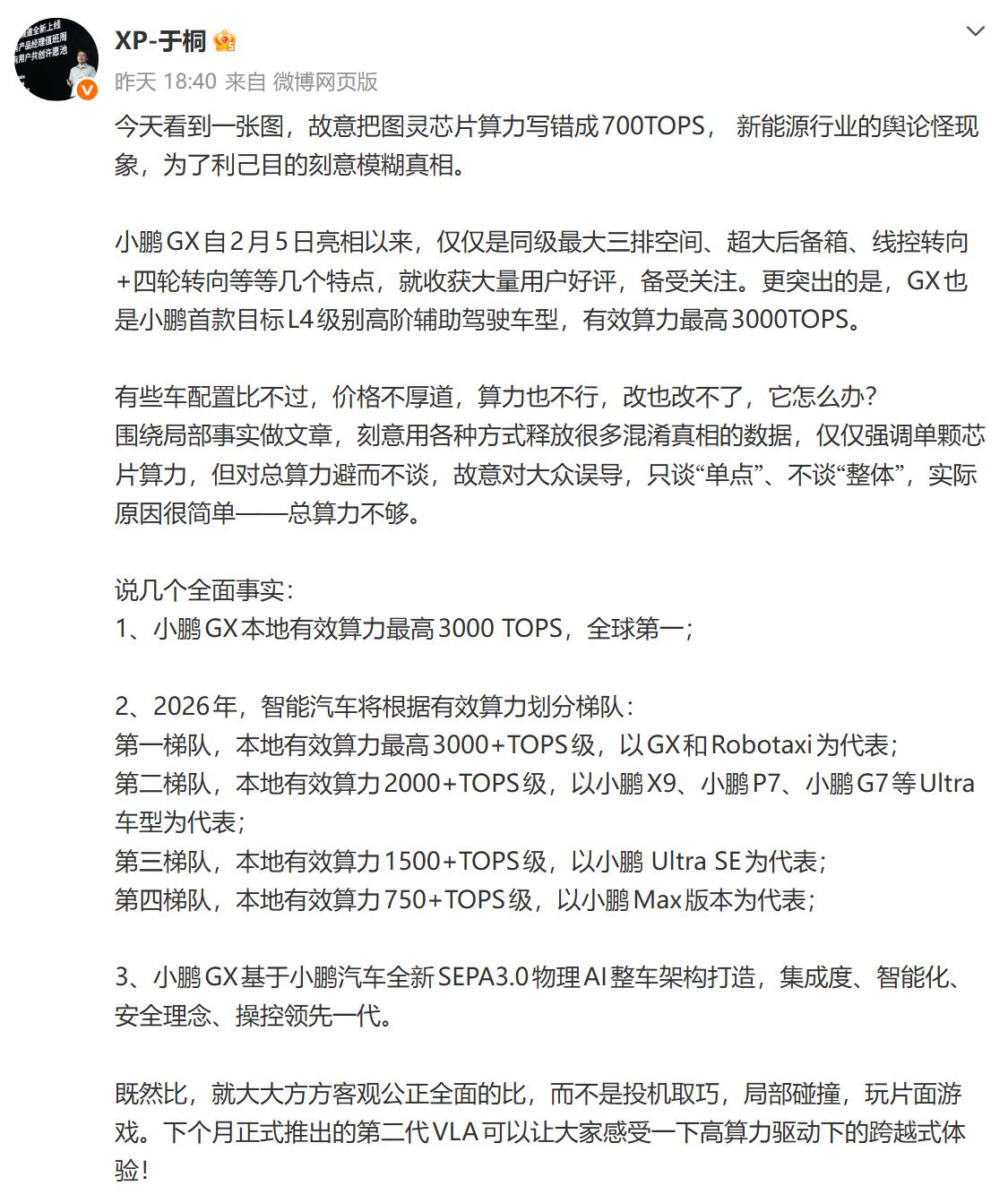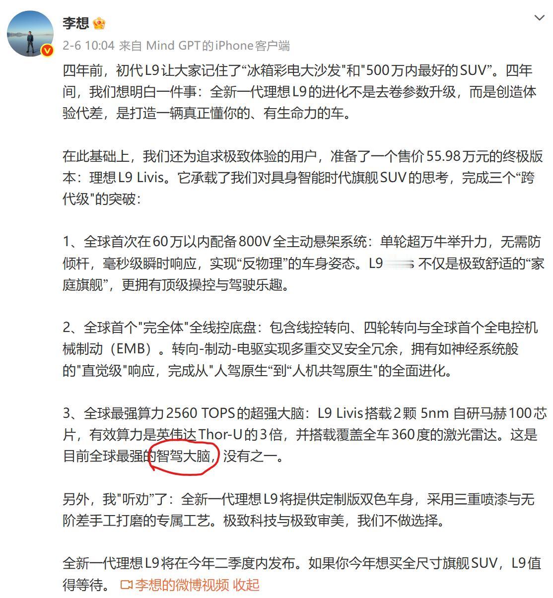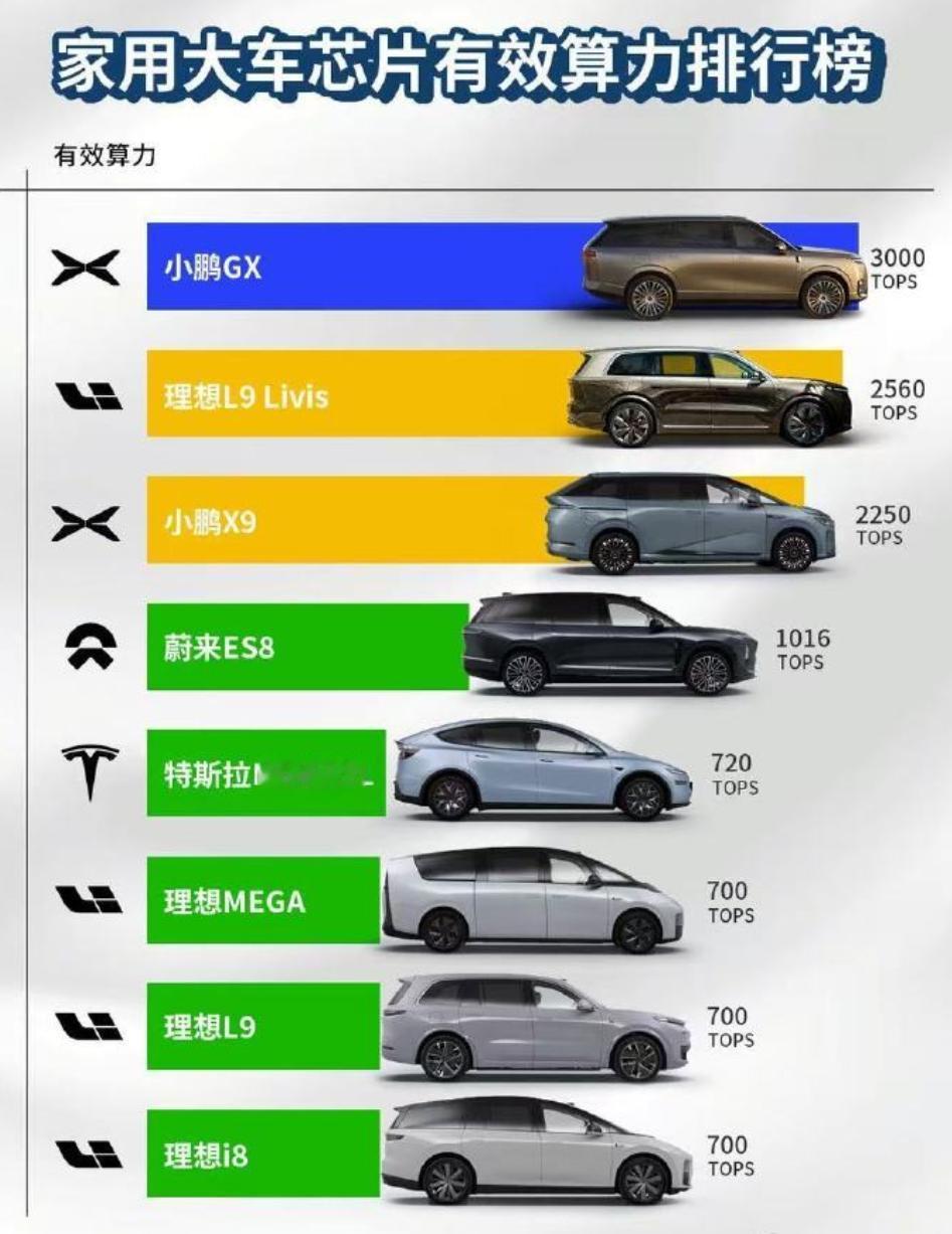 都别吵了,关于谁是最强算力之争,没有一个说对的。 最近几天,关于理想和小鹏谁的算力最强,网上吵得不可开交,但仔细看看,都有很多漏洞,并且把已量产和未量产、单芯片和整车算力、智驾和整车算力混为一谈。 1、图1对比的是单芯片算力,小鹏的图灵芯片算力写错了;理想的芯片还没正式上车,其他的都已上车。 2、图2对比的整车算力,蔚来的应该用ET9的双芯片2000T+代表;理想的不好说,实际可能3000+,见后面分析。 3、图4中,按李想的说法,L9 Livis上的两颗芯片应该只是智驾用。座舱芯片暂不清楚,按网上的信息,可能是高通的8797。所以如果智驾和座舱的算力加起来应该是超过3000T的。 4、小鹏的GX也没上市,并且是整车4个图灵芯片(座舱应该至少一个芯片)。 5、所以如果只论单芯片算力,理想的最强;如果只论智驾算力,也是理想的最强;如果按整车算力就不一定了,最强的可能是理想,也可能是小鹏。 最后,争论这个意义也不是很大,体验才是最重要的。