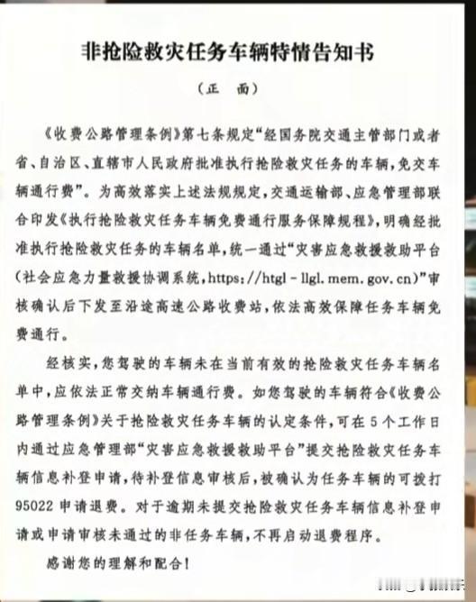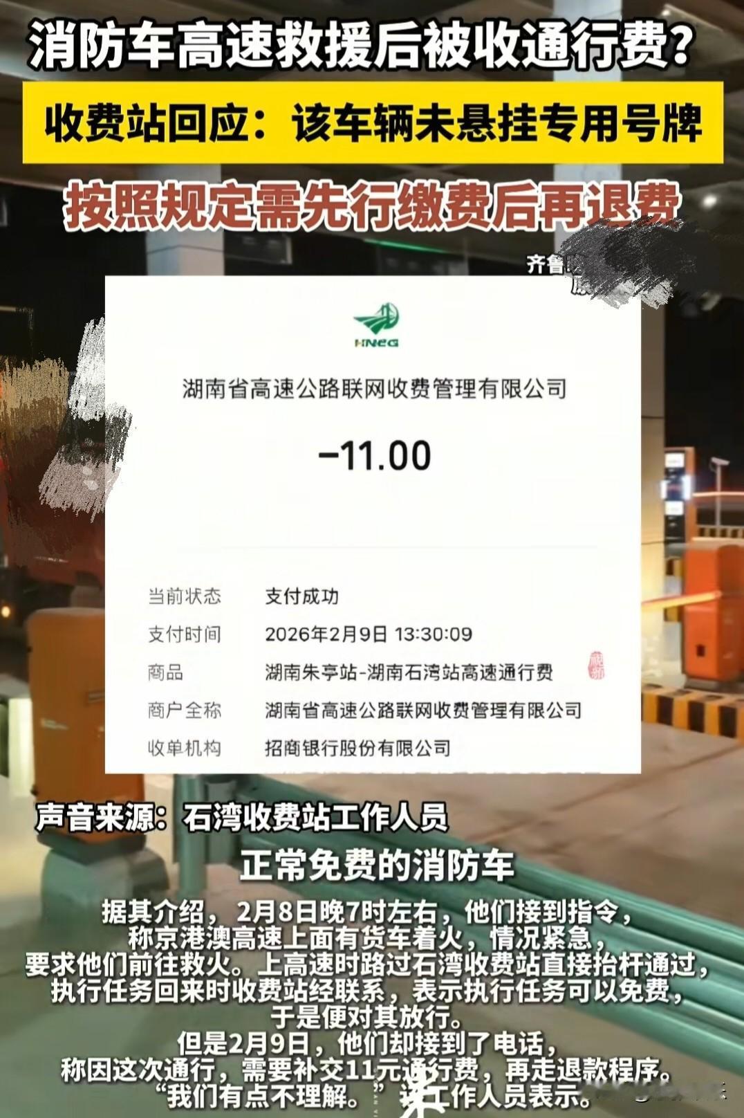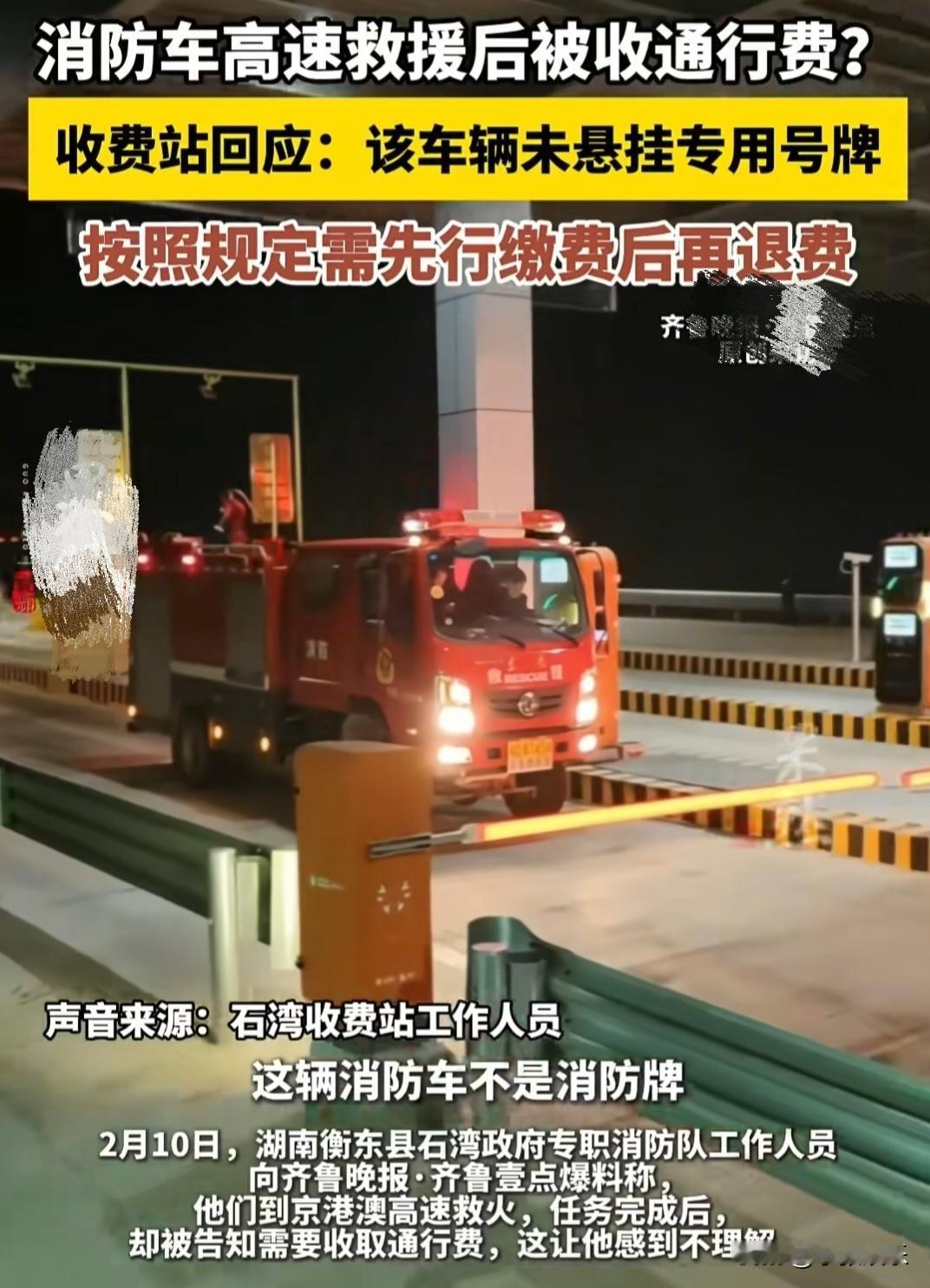 “无规矩不成方圆,涨知识了” 2月8日的晚上,京港澳大桥有货车起火,石湾消防接指令出发救援。 救援完成返回后,在石湾收费站,被告知需要交纳11元的高速费。这让队员们很不解。但是还是缴纳了! 收费站解释: 这救援车辆,没有按规定悬挂救援专用号牌,而是地方黄牌,。 并且该车也没有在《执行抢险救灾任务车辆免费通行服务保障规程》名单中。 并且根据该《规程》,收费站一要先按照非任务车辆正常收取车辆的通行费,并向车辆车主提供《非强行救灾任务车辆特情告知单》事后是可以申请走退费流程的。 那么国家综合性消防救援车辆悬挂的号牌为怎样的呢? 号牌为白底黑字,配以红色汉字“应急”两字。汽车号牌每副两只,分别悬挂在车辆前后部,就是要像正常车一样,前后挂牌。 你还知道关于消防救援车辆的哪些规定呢?评论区聊一聊。让大家都长长知识。