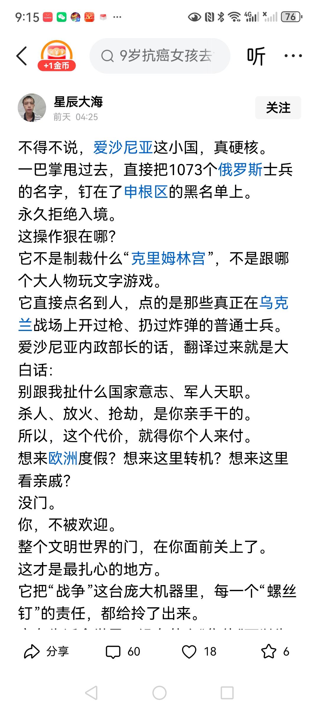 弹丸小国爱沙尼亚又开始跳了,这不,他们又公布一一个新的对俄制裁名单,这个名单上并没有那些俄知名人士,而是一些正在参加对乌作战的普通俄国士兵。将他们拉进了申根协定的黑名单,也就是说如果这些俄国士兵在想出国旅游什么的,就不能从爱沙尼亚转机......。 问题是这个制裁有用吗?俄国头上已经有两万多项制裁了,还怕多了你这个? 在说了,一旦战争结束,大部分制裁都会撤销,人家要出国一定非要从你爱沙尼亚走吗?从波兰出境他不香吗?