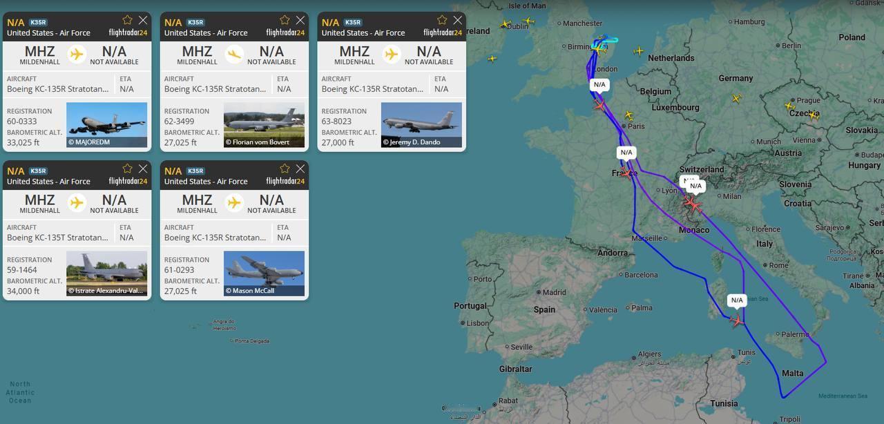 三架KC-135R/T“战略加油机”空中加油机从英国米尔登霍尔皇家空军基地起飞,向南穿越欧洲,为六架F-35A“闪电”战斗机提供空中加油支援。这些战斗机隶属于佛蒙特州空军国民警卫队第158战斗机中队“绿山男孩”飞行队,正在从英国拉肯希思皇家空军基地出发,前往约旦穆瓦法克·萨尔蒂空军基地执行任务。