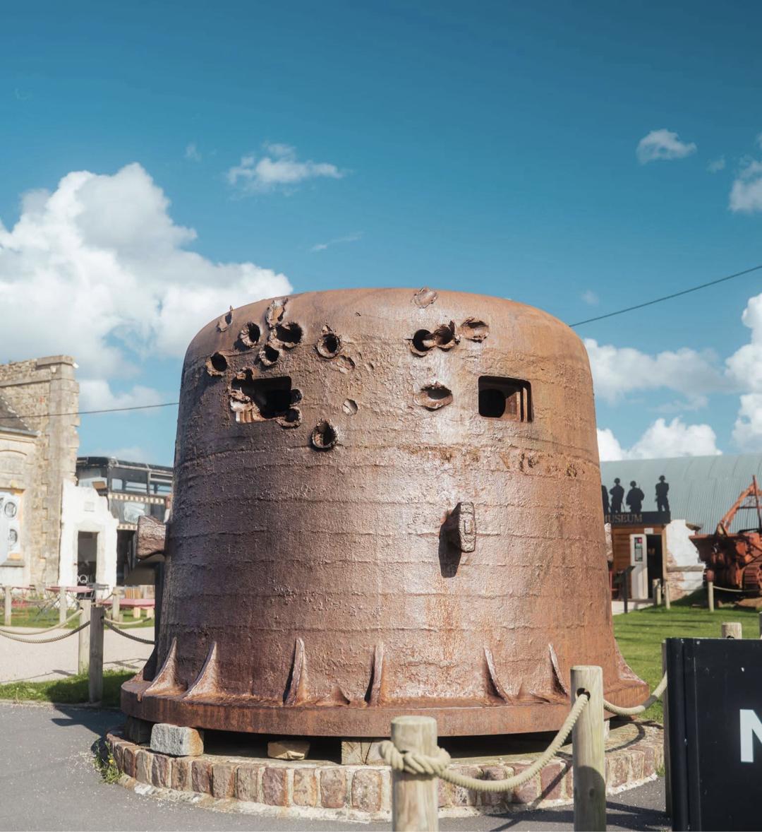 一个在奥马哈的装甲钟堡垒。该钟炮壁厚250-295毫米,重56吨,内径2.25米。该钟在其周围为机枪提供了六个等间距的保护射击位置,标准做法是一次只使用两个位置。它由极厚的铬钼钢建造而成,部分埋在混凝土底座中。如图所见,这一枚已经被多次击中,但无一击穿,说明该钟堡垒质量不是一般的好。