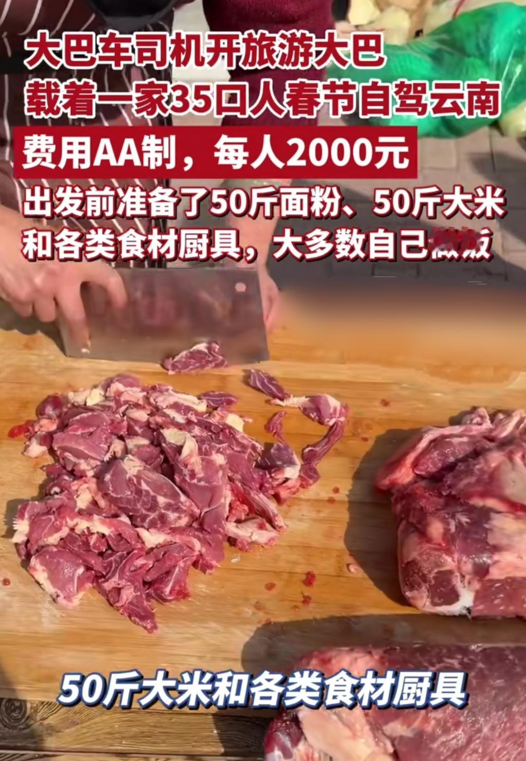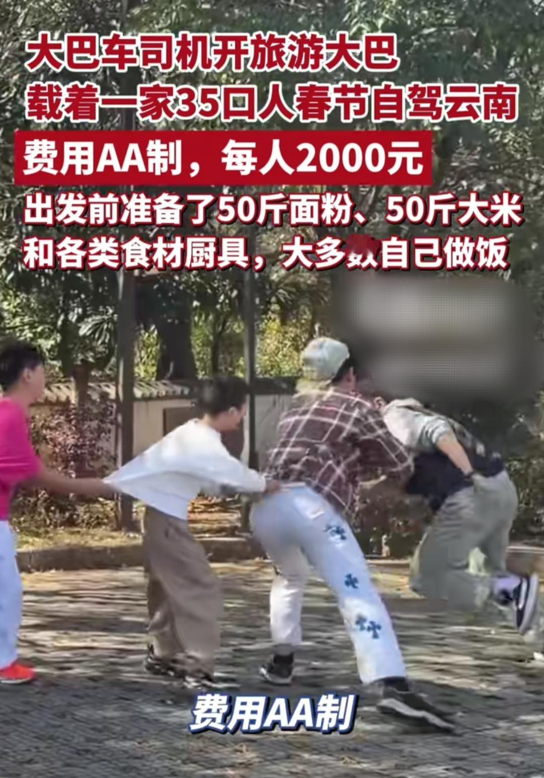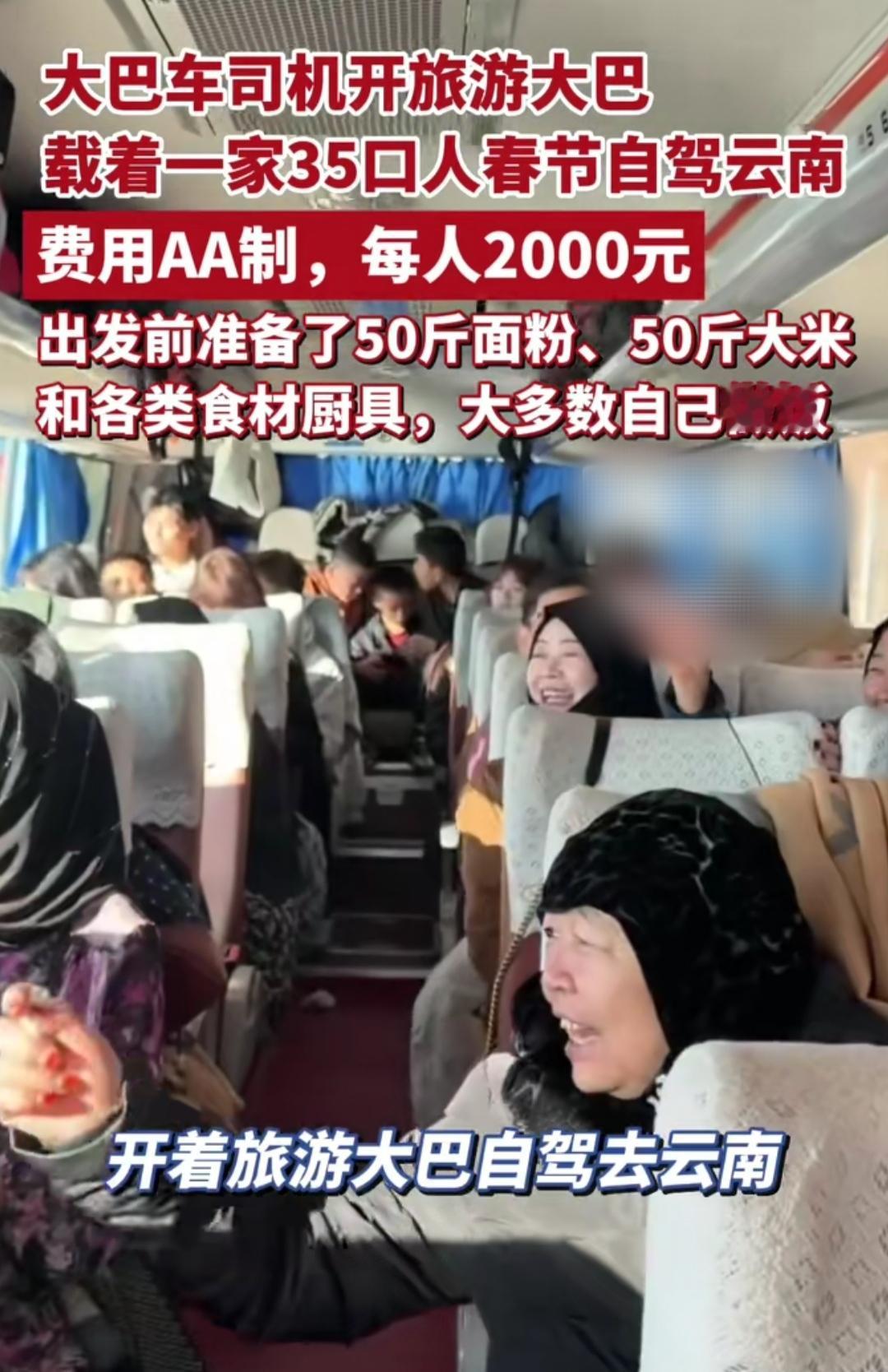 春节最羡慕的团圆出现了!青海西宁赵氏家族35口人四代同堂,包了辆大巴自驾云南过新年,6岁娃娃到75岁老人全上阵,14天的旅途,把团圆的幸福感拉满了。 一家人分工超清晰,导游、财务、厨师各有专人,出发前还备了50斤面粉50斤大米,路上大多自炊,偶尔尝当地特色,费用AA每人预缴2000,晚辈还额外赞助,让家里老人免费享福。 全程自驾不走急路,每天行车不超300公里,从西宁出发途经川滇多地,还要去西双版纳住上几天,返程顺路打卡贵州、重庆,一路看风景唠家常,既弥补了日常聚少离多的遗憾,还能带着孩子见识各地风土人情,这趟旅行你羡慕了吗?