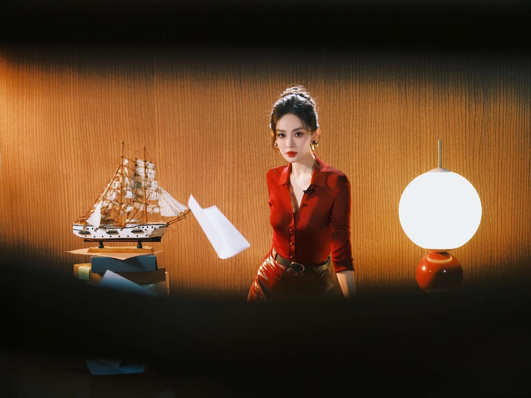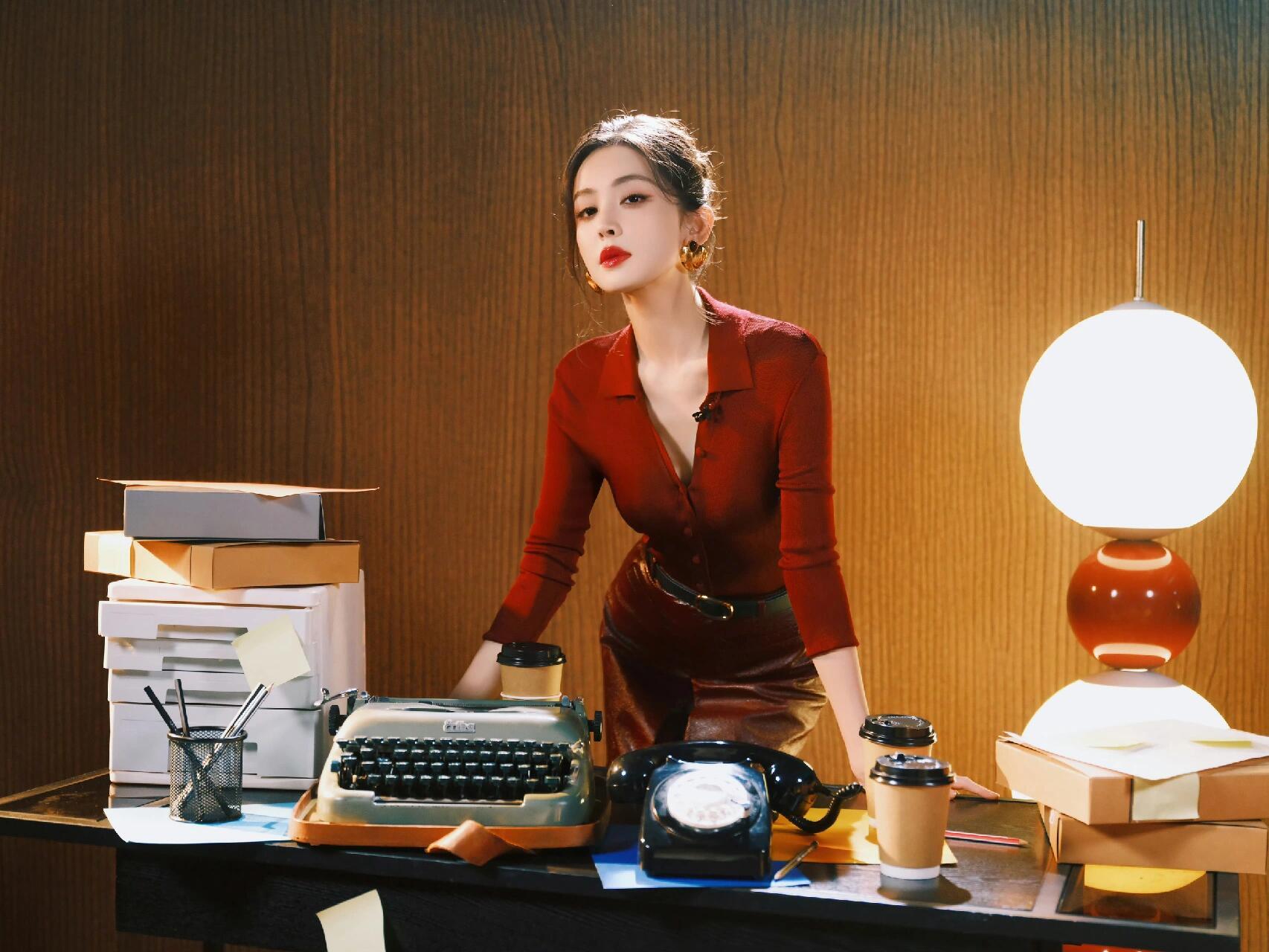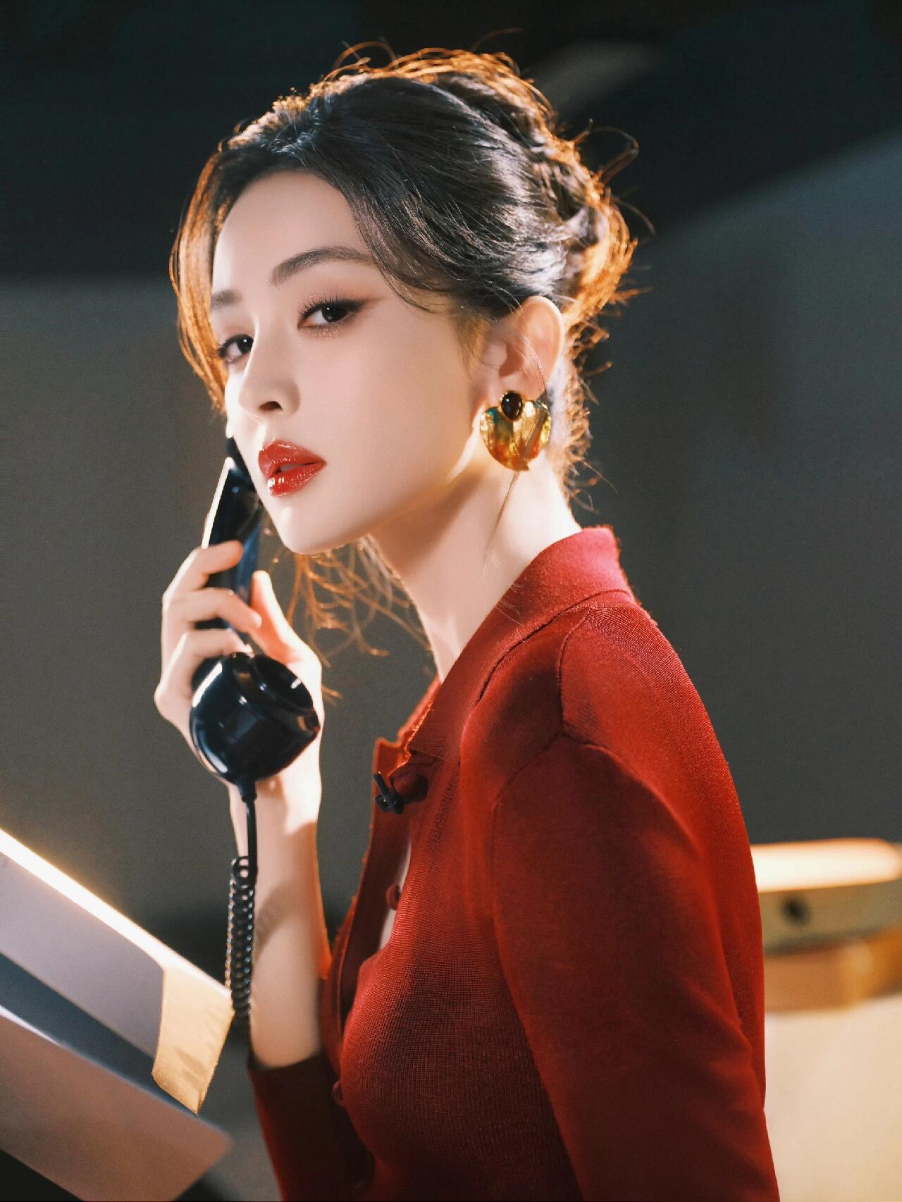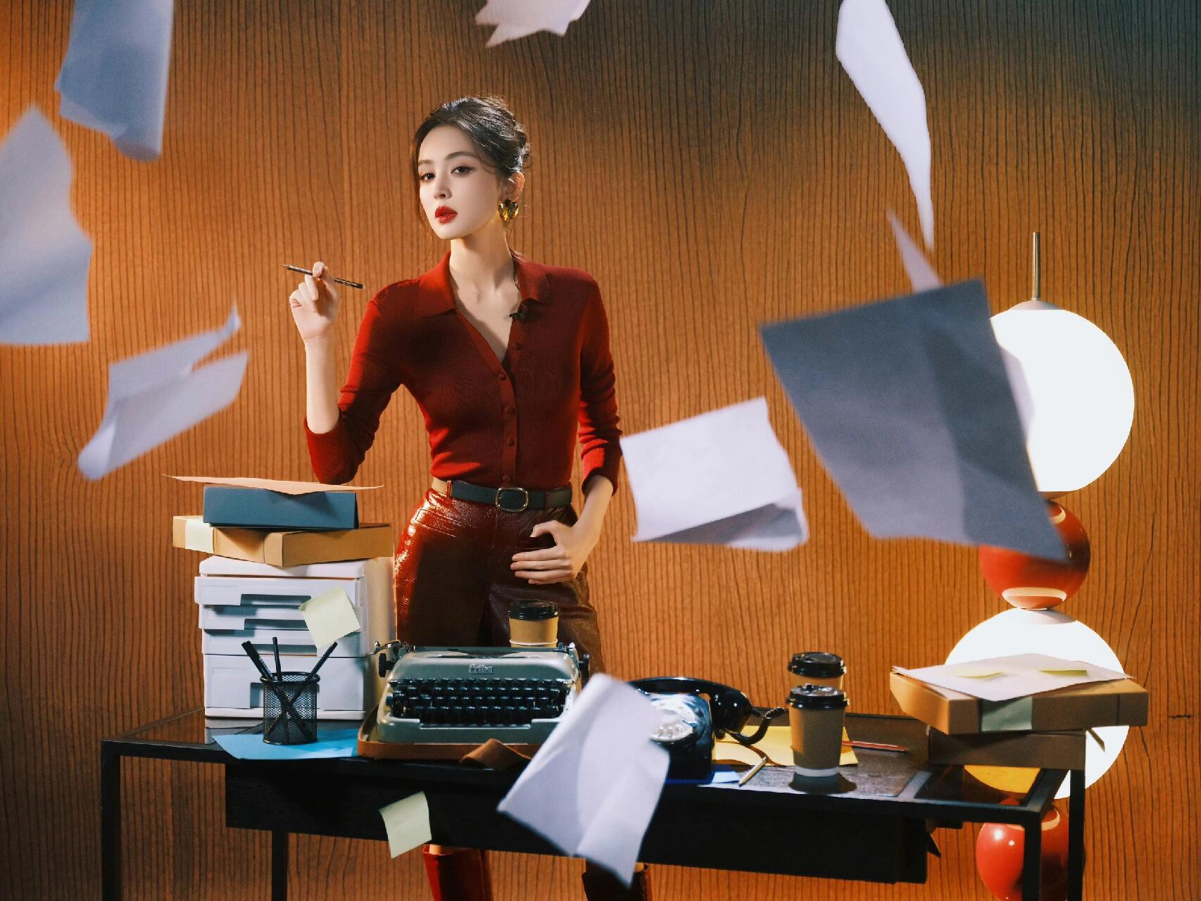 明艳红唇+利落卷发,酒红衬衫搭皮裙,娜扎的港风造型又美又飒,气场直接拉满!