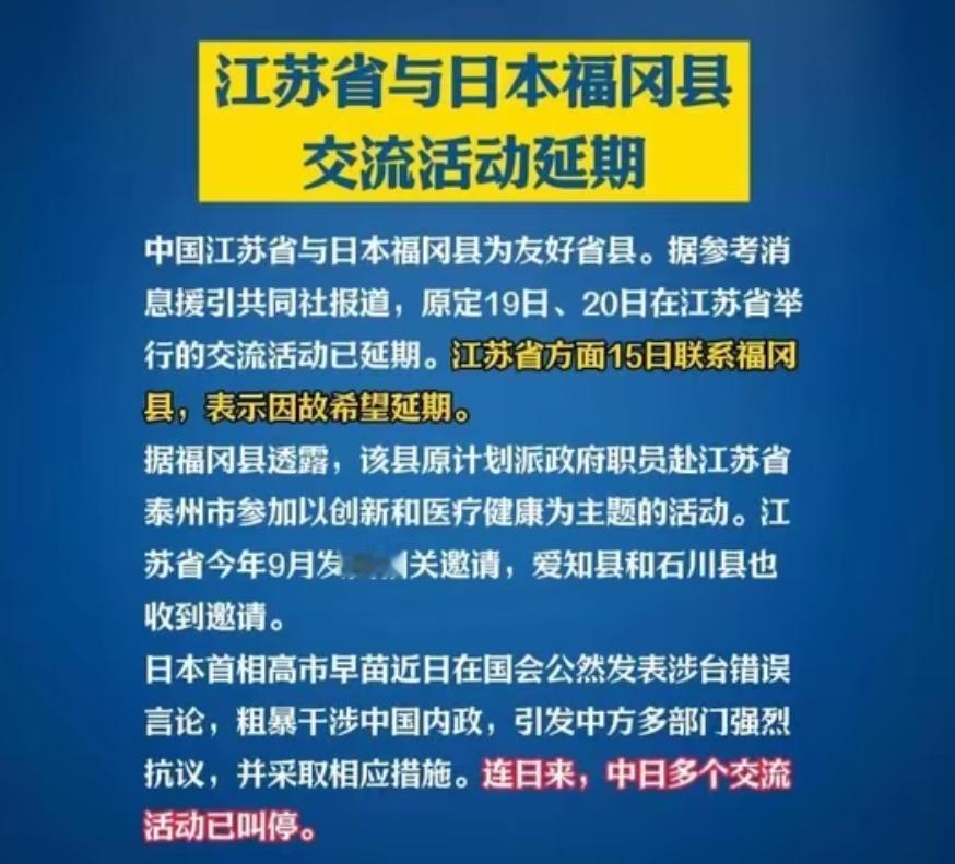 中日之间已经没有“友好”关系了?日本福冈县宣布,中国江苏省向日本福冈县通报,由于不可预见的原因,推迟原定于11月19日至11月20在江苏省举办的交流活动。 说白了,这次江苏推迟和日本福冈的交流活动,根本不是什么“不可预见的原因”。这就是双方表面的友好假象,被现实矛盾直接戳破的真实结果。 江苏与福冈县1992年正式缔结友好省县关系,这是中日地方交流的重要合作载体。三十余年的友城往来,曾是中日地方友好的标志性案例。 日本近期在涉台、历史认知等议题上的错误举动,早已触碰中方核心利益底线。我国官方已多次对日方的不当言行提出严正抗议。 地方友好交流的推进,必须以国家双边关系的稳定为前提。日方持续挑衅中方,地方交流项目被迫调整是必然的走向。 “不可预见的原因”只是外交场合的委婉表述,并非真的存在未知突发状况。福冈县官方完全清楚交流推迟的核心根源。 中日友好的根基,从来都是日方恪守承诺、尊重中方核心利益。日方奉行两面做法,只会不断瓦解双边的互信基础。 此次交流延期并非孤立事件,而是近期中日地方交流遇冷的集中体现。只维系形式上的友好,根本无法弥合双边的核心分歧。 各位读者你们怎么看?欢迎在评论区讨论。