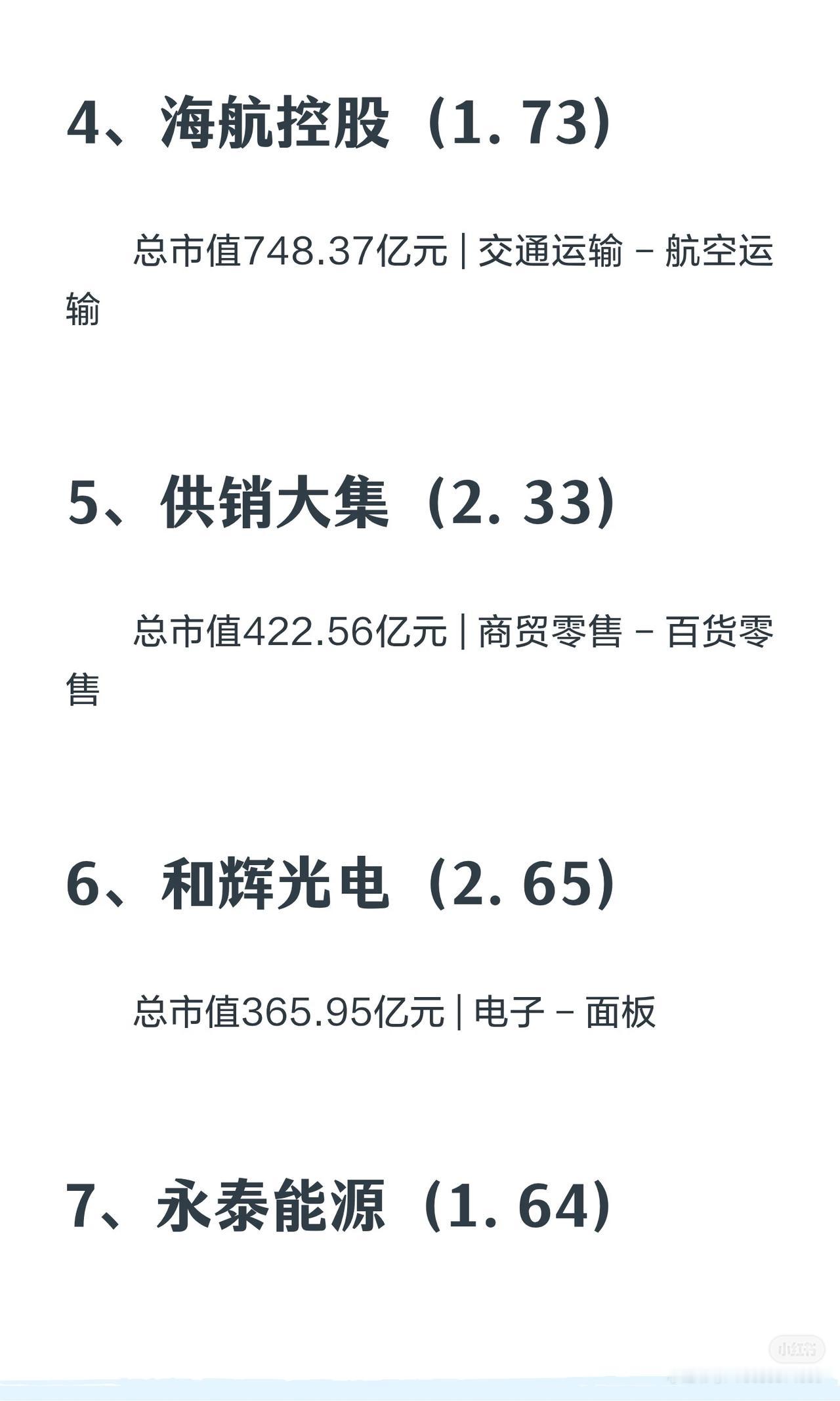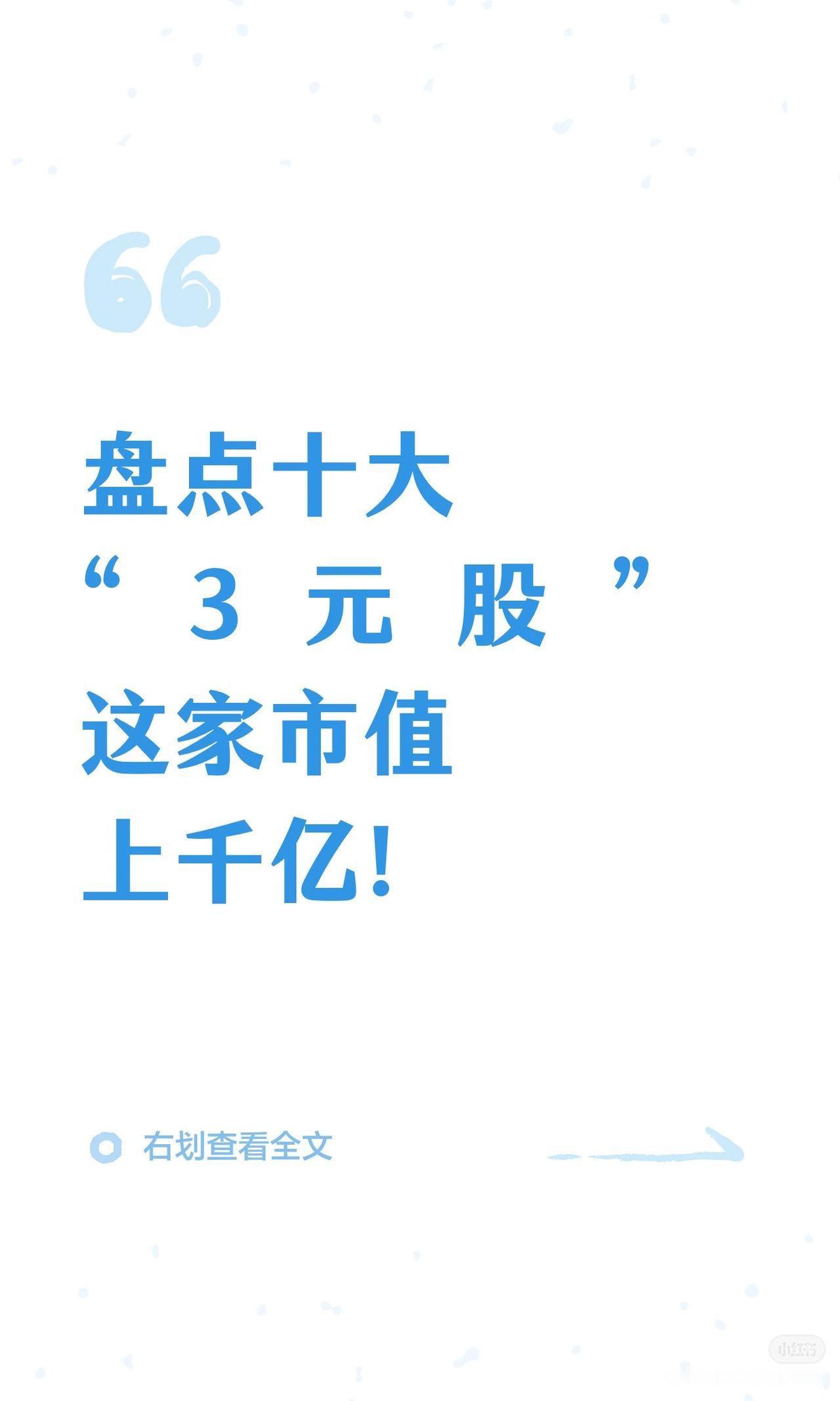 当前总市值排名前十的“3元股”(股价均低于3元但市值超千亿或较高),具体如下: 1. 包钢股份(2.66元):总市值1204.68亿元,钢铁-普钢; 2. 中国能建(2.41元):总市值873.73亿元,建筑装饰-基础建设; 3. 浙商银行(3.00元):总市值784.16亿元,银行-股份制银行; 4. 海航控股(1.73元):总市值748.37亿元,交通运输-航空运输; 5. 供销大集(2.33元):总市值422.56亿元,商贸零售-百货零售; 6. 和辉光电(2.65元):总市值365.95亿元,电子-面板; 7. 永泰能源(1.64元):未完整显示业务及市值; 8. 某公用事业-火电公司:总市值357.81亿元(原文未明确公司名); 9. 辽港股份(1.66元):总市值347.82亿元,交通运输-港口; 10. 中远海发(2.70元):总市值297.58亿元,交通运输-航运; 11. 建元信托(2.85元):总市值280.57亿元,非银金融-多元金融。