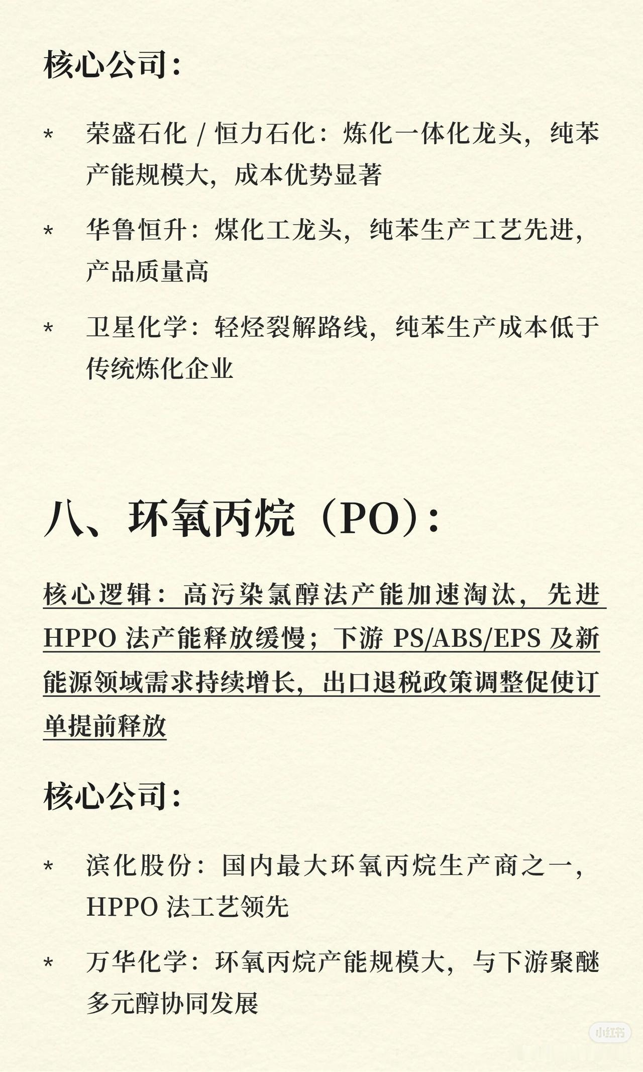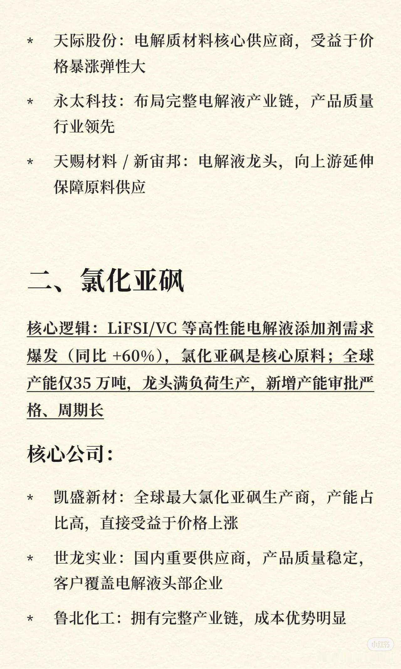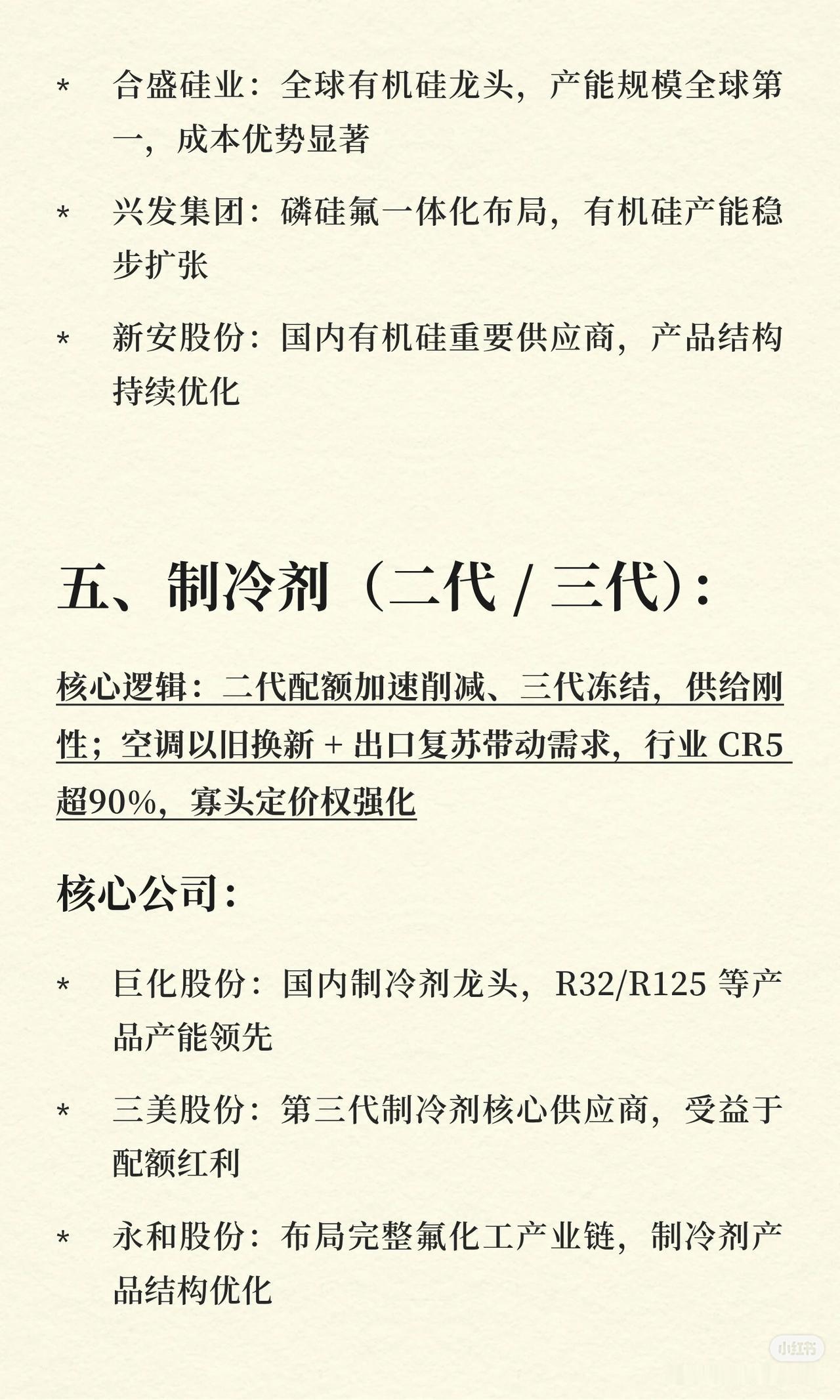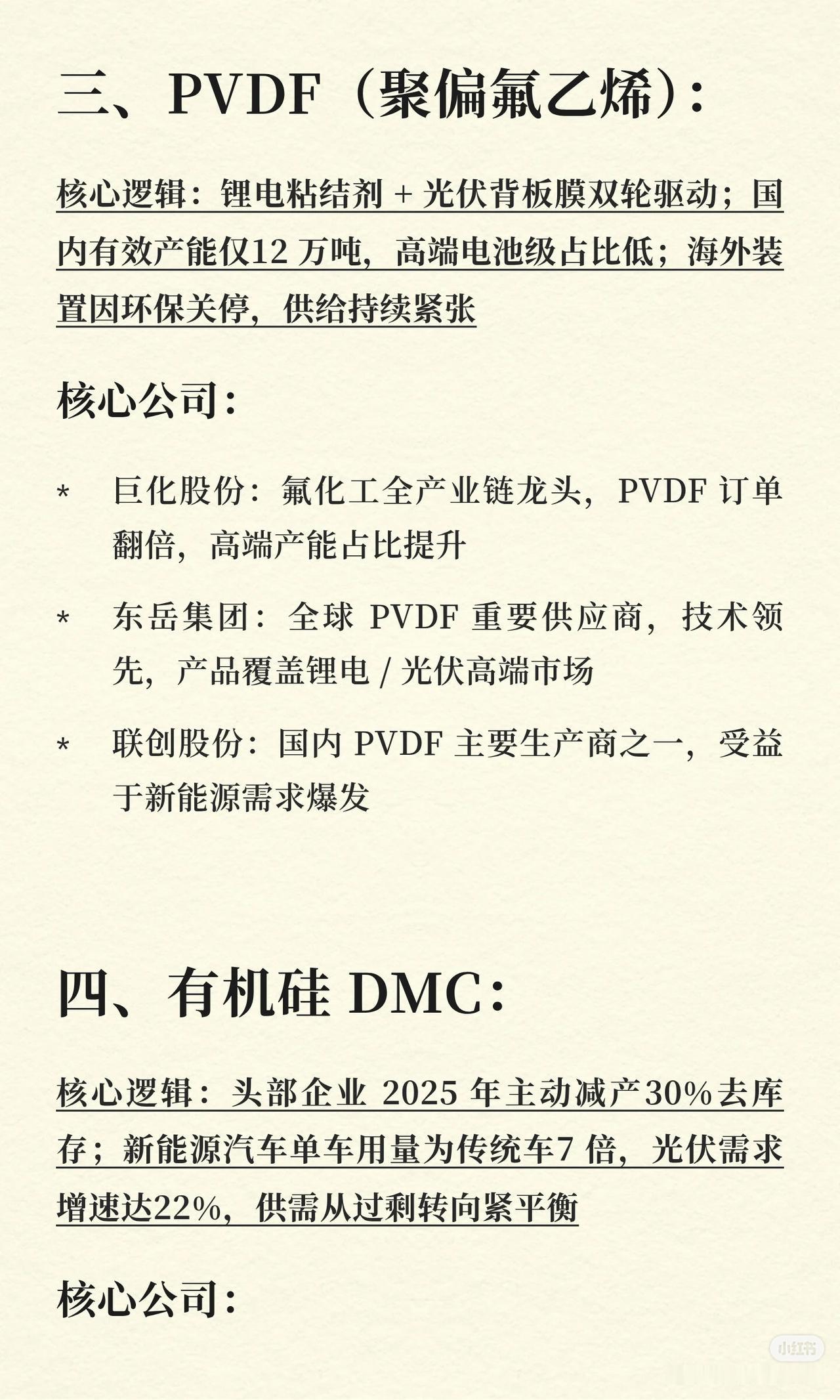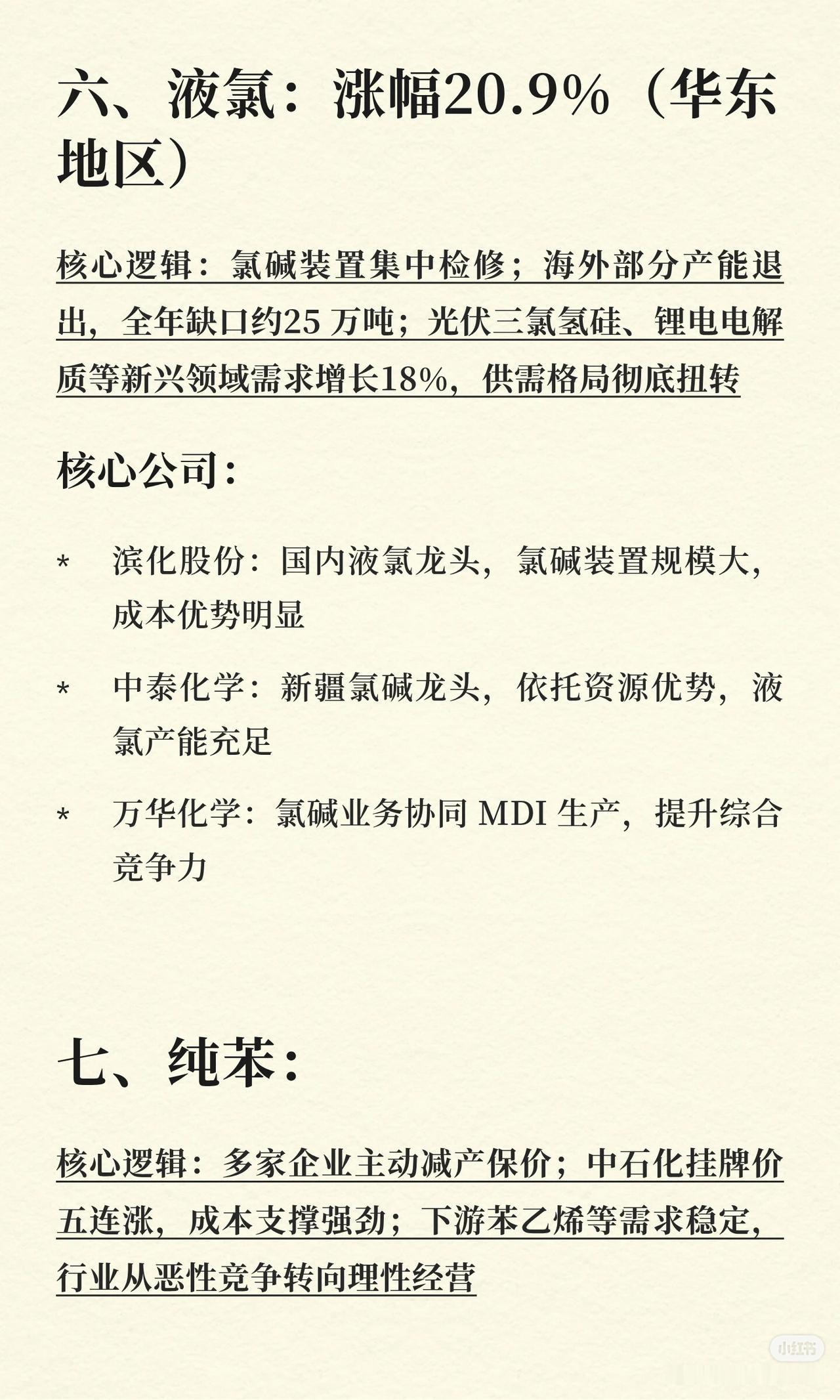 2026 年涨价最凶的 8 个化工细分领域及要点如下: 1. 六氟磷酸锂 - 核心逻辑:2025 年产能收缩超 30%,2026 年新增仅 2 万吨;储能+动力电池需求增 45%,库存低于 15 天,供需错配。 - 核心公司:多氟多(龙头,产能与成本优势)。 2. 氯化亚砜 - 核心逻辑:LiFSI/VC 等添加剂需求爆发(+60%),氯化亚砜为核心原料;全球产能仅 35 万吨,龙头满产,新增审批严、周期长。 - 核心公司:凯盛新材(全球最大)、世龙实业、鲁北化工。 3. PVDF(聚偏氟乙烯) - 核心逻辑:锂电粘结剂+光伏背板膜双驱动;国内有效产能仅 12 万吨,高端占比低,海外装置关停致供给紧张。 - 核心公司:巨化股份、东岳集团、联创股份。 4. 有机硅 DMC - 核心逻辑:头部企业 2025 年减产 30%去库存;新能源车用量为传统车 7 倍,光伏需求增速 22%,供需转紧平衡。 - 核心公司:合盛硅业、兴发集团、新安股份。 5. 制冷剂(二代/三代) - 核心逻辑:二代配额削减、三代冻结,供给刚性;空调以旧换新+出口复苏带需求,CR5 超 90%,寡头定价权强化。 - 核心公司:巨化股份、三美股份、永和股份。 6. 液氯 - 核心逻辑:氯碱装置集中检修,海外产能退出,全年缺口约 25 万吨;光伏三氯氢硅、锂电电解质等需求增 18%,供需扭转。 - 核心公司:滨化股份、中泰化学、万华化学。 7. 纯苯 - 核心逻辑:企业主动减产保价,中石化挂牌价五连涨,下游需求稳定,行业转向理性经营。 - 核心公司:荣盛石化/恒力石化、华鲁恒升、卫星化学。 8. 环氧丙烷(PO) - 核心逻辑:高污染氯醇法产能加速淘汰,HPPO 法释放慢;下游 PS/ABS/EPS 及新能源需求增长,出口退税调整促订单提前。 - 核心公司:滨化股份、万华化学。 以上即为 8 个细分领域的核心逻辑与代表公司。