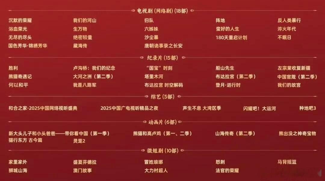2025年电视剧年鉴发布!电视剧(网络剧)(18部)沉默的荣誉、我们的河山、归队、阵地、反人类暴行浴血荣光、生万物 、六姊妹、蛮好的人生、淬火年代无尽的尽头、绝密较量、沙尘暴、180天重启计划、不眠日、国色芳华、锦绣芳华 、藏海传、唐朝诡事录之长安