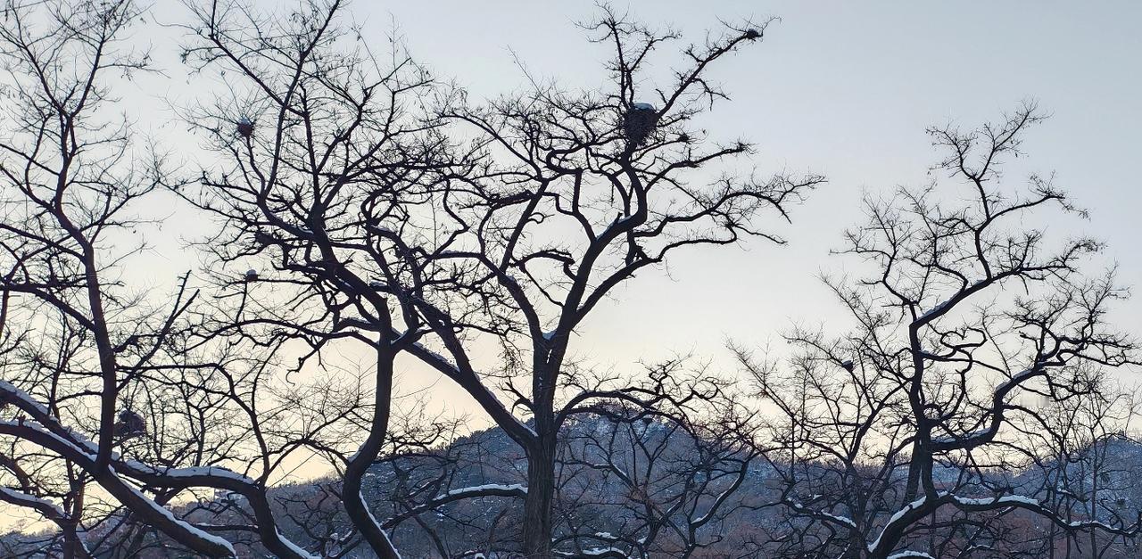 楼前的梧桐树,树梢上还挂着几片叶子,它们不舍的落下来,还再啃老本?叶子黄了,但这