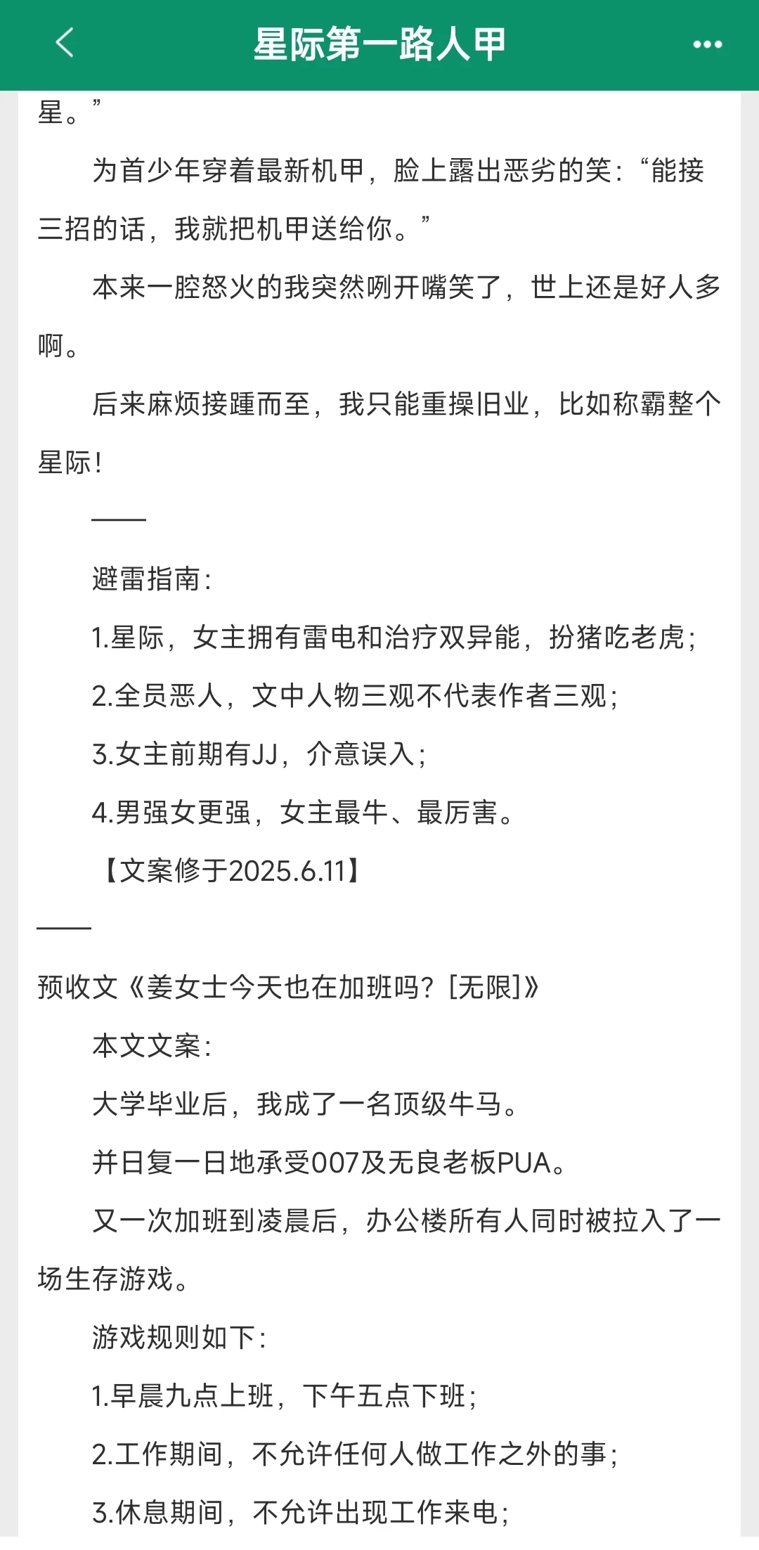连载中可蹲完结 星际女强爽文😋 女主莫名来到了星际世界,普通人变成了女beta,身上多了以前没有的器官……这玩意还还会压制她的异能。女主第一反应就是要割掉它!但手术很贵,女主只好当起了赏金猎人,打破了她本来可以开启的平静的生活。 本来在末世就很强的女主在未知的世界摸爬滚打,到头来却发现打遍天下无敌手😎 目前女主已经攒到钱割掉了beta和人类不一样的器官()笑晕了。