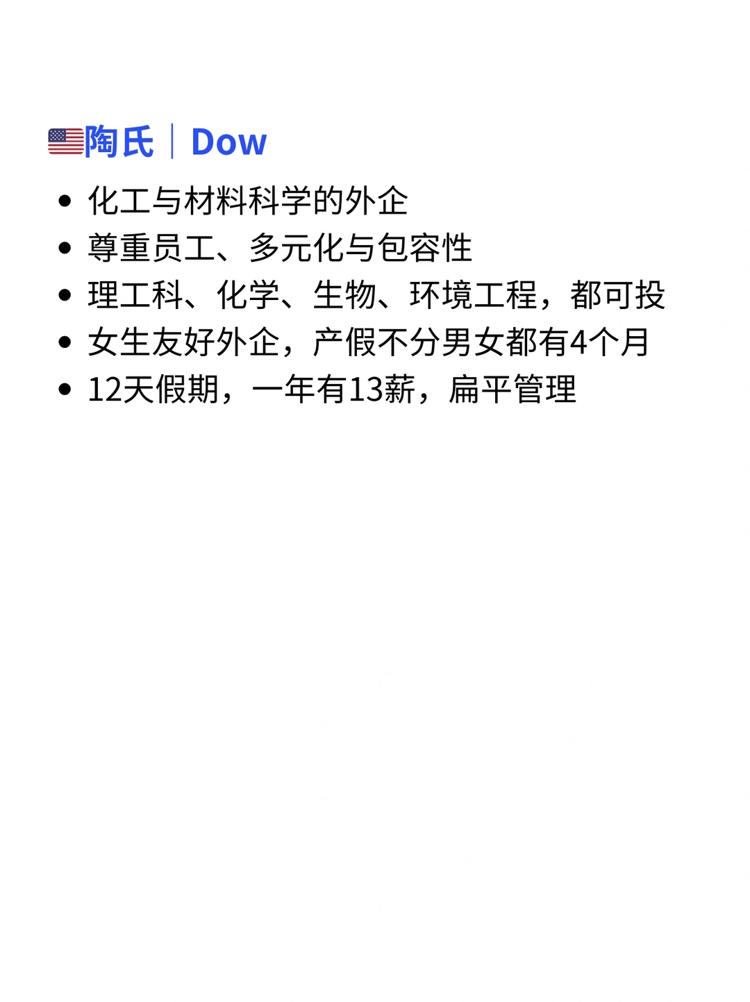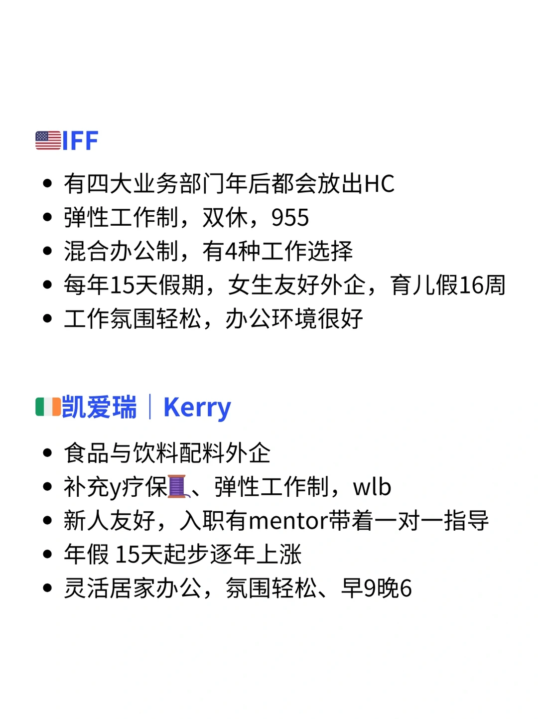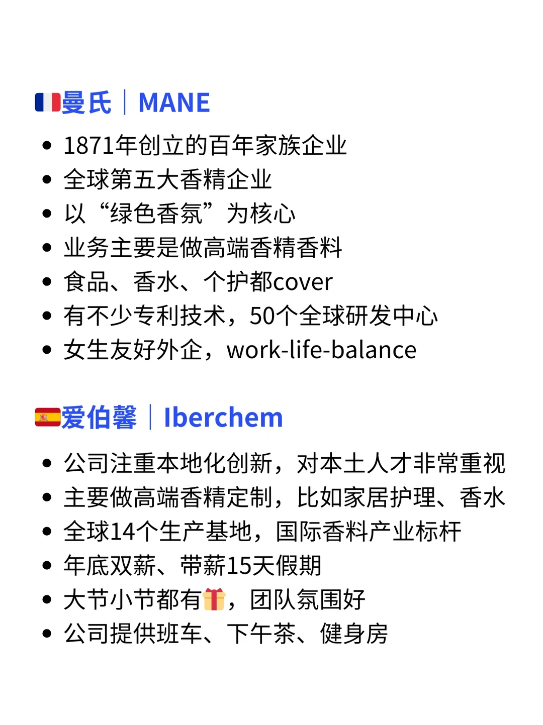 如果姐妹们想找不内卷、女生友好、能wlb的公司,香料公司真的可以闭眼冲~✨ · 香料行业虽然听着冷门,但是从你吃的零食,到洗发水/香水/护肤品...几乎所有都离不开香料的加持 · 工作节奏955是标配足够的wlb 15-20天假期,部分企业圣诞还放长假 灵活的办公模式,有些甚至是4天工作制 · ✅今天和大家分享几家口碑非常好的香料类外企【详细介绍👀见图】 🇺🇸IFF - 弹性工作制,双休,955 - 每年15天假期,女生友好外企,育儿假16周 · 🇮🇪凯爱瑞|Kerry - 补充保🧵、弹性工作制,wlb - 年假 15天起步逐年上涨 · 🇫🇷曼氏|MANE - 以“绿色香氛”为核心,注重环保与数字化创新 - 有不少专利技术,50个全球研发中心 · 🇪🇸爱伯馨|Iberchem - 主要做高端香精定制,比如家居护理、香水 - 年底双薪、带薪15天假期 - 公司提供班车、下午茶、健身房 · 🇺🇸陶氏|Dow - 尊重员工、多元化与包容 - 女生友好外企,产假不分男女都有4个月 · 🙋‍♂️(求职版) 💙我是瑞池,每日分享外企求职干货 -