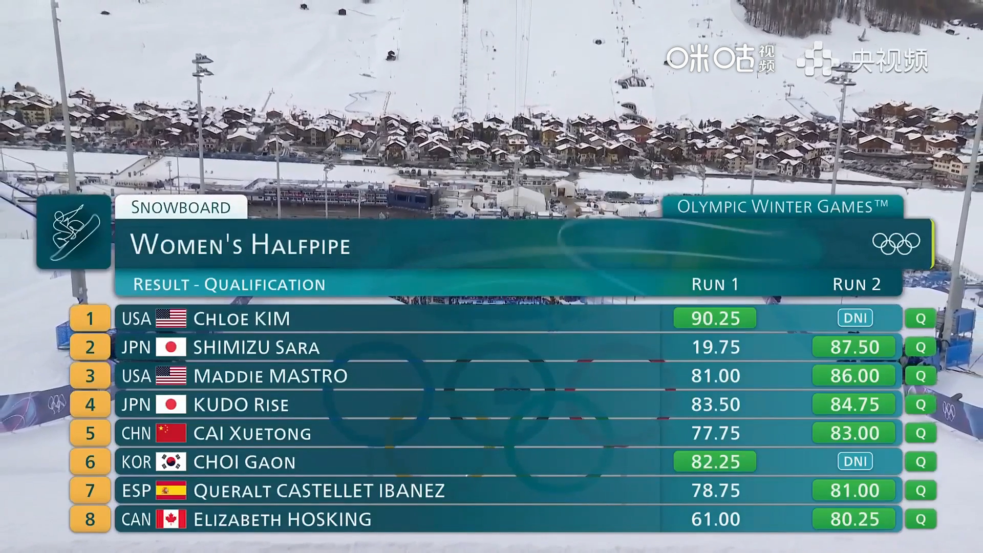 米兰冬奥会单板滑雪女子U型场地技巧预赛结束,蔡雪桐第5、武绍桐第12,夺得决赛门票。另两位中国选手刘佳宇、杨露无缘晋级。
