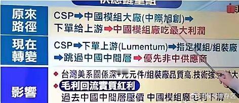 今天光模块大跌,到底什么原因?主要是湾湾省一个新闻闹的,他们认为易中天三家公司吃了太多利润 所以,美国巨头直接就去上游买光芯片了。这事看上去十分搞笑。人在岛上呆长了,眼光就会变的狭隘。不如早点回来国际巨头选择中国光模块产业链,是他们傻吗?显然不是,就是因为便宜。。目前全球范围内,能大规模、高良率、低成本把 Lumentum 的芯片封装成 800G/1.6T 模块的,只有中际旭创和新易盛。湾湾想唱空大陆的产业链,自己拿更多的订单。先看看能不能做到同样成本。。。