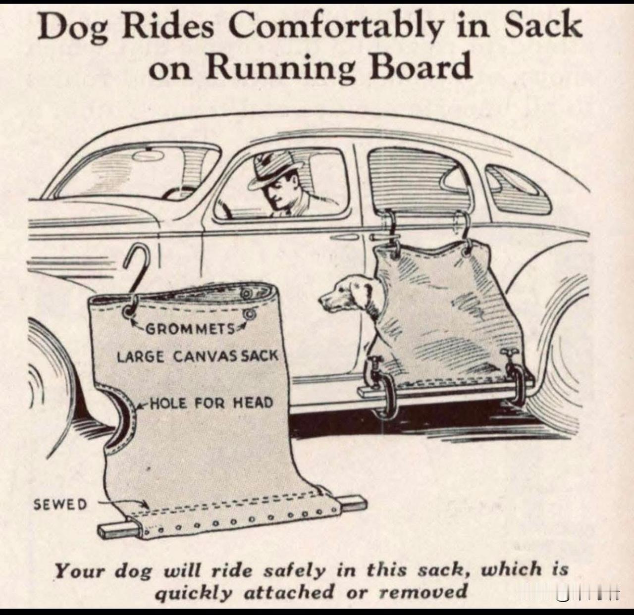这幅插图展示了一项真实的历史发明——狗袋 (Dog Sack)。 这项奇特的汽车配件的广告最早出现在 1935 年 6 月 或 1936 年 6 月 的美国《大众机械》(Popular Mechanics) 杂志上。 产品背景与设计 初衷: 当时的发明者认为,这种设计既能防止宠物弄脏车内空间(如掉毛或发生意外),又能让狗在旅途中呼吸新鲜空气。 构造: 这是一个大型帆布袋,底部通过夹子固定在汽车的踏板 (Running Board) 上,顶部则用带有橡胶套的钩子挂在车窗下沿,以防划伤车漆。 细节: 帆布袋侧面开有一个孔,专门让狗伸出头部享受微风。 历史评价 尽管当时的广告宣称这种方式“安全且舒适”,但它并未获得广泛认可,甚至被现代媒体评为“史上最糟糕的汽车发明之一”。其主要问题包括: 安全隐患: 狗完全暴露在车外,容易受到飞溅的碎石、灰尘或恶劣天气的影响。 操作风险: 驾驶员在开启车门时可能会不小心撞到狗的头部。 这一发明现已成为 20 世纪早期人们探索宠物出行方式的一个猎奇缩影。