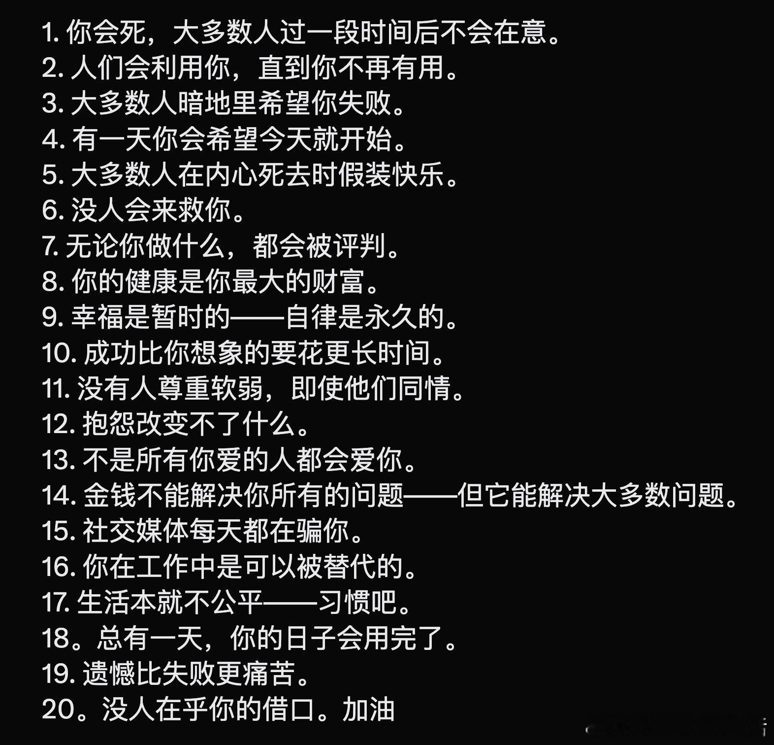 你终将离开这个世界,而大多数人不会在意太久。你会被利用,直到失去价值。很多人暗自希望你失败。你在工作中随时可被替代。生活不公平,习惯就好。