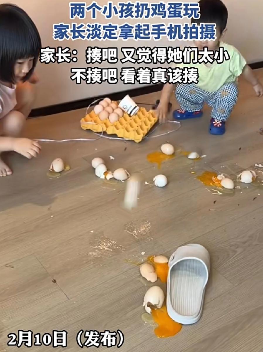 所以,家长在揍与不揍之间选择网暴? 俩小孩扔鸡蛋玩,家长不阻止,嘴上喊着“完了完了”,却淡定拿起手机拍摄。表示:揍吧,又觉得她们太小,不揍吧,看着真该揍。 一板鸡蛋是值不了多少钱,扔一两个那是不懂事,一直扔家长不阻止不教育,放任她们玩。这是想让孩子学什么?学会浪费食物?锻炼糟蹋食材的胆量? 惯子如杀子,三岁看大,七岁看老。更何况孩子看着也不小了,现在不教不制止,她们以为扔鸡蛋是对的事情,下次可能就是几箱几箱的砸了。 这为了流量也没谁了!这就是在害孩子啊!是我的孩子的话,我会马上给她们一个完整的童年!让她们记住浪费可耻!
